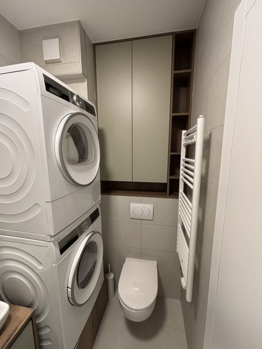 Stan je opremljen namještajem njemačkog proizvođača Nolte (kuhinja, dnevni boravak ormar - tv komoda, spavaća soba ormar + viseći elementi). Kuhinja je opremljena kućanskim uređajima marke Bosch (ugradbeni kombinirani hladnjak 177cm, pećnica (piroliza), perilica posuđa, indukcijska ploča, napa) te Franke (sudoper, slavina). Kupaona je opremljena Bosch perilicom rublja i sušilicom rublja povezane veznim elementom (vertikalno postavljanje). Ostak namještaja Prima commerce Premium linija te namještaj izrađen po mjeri.