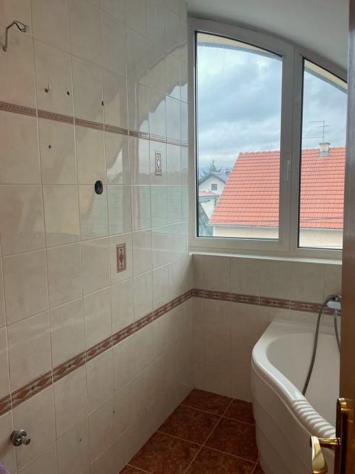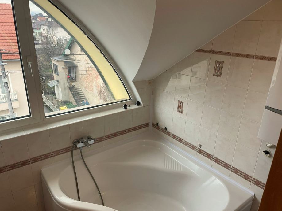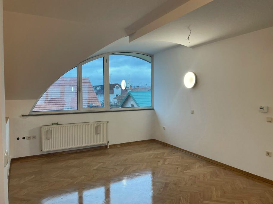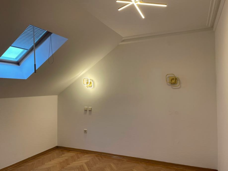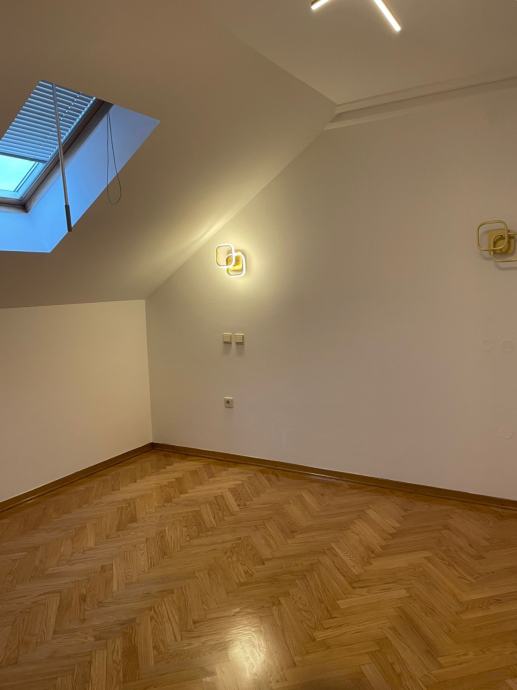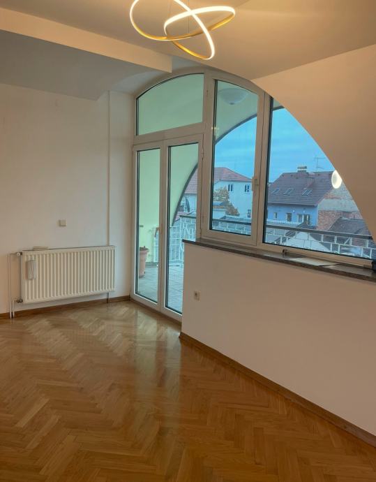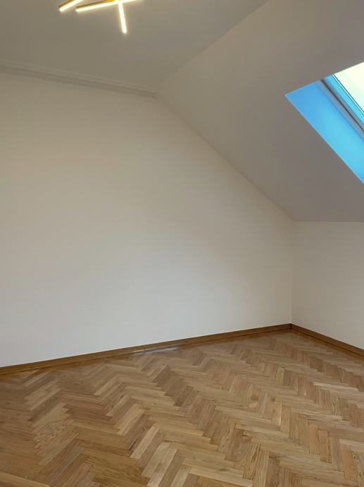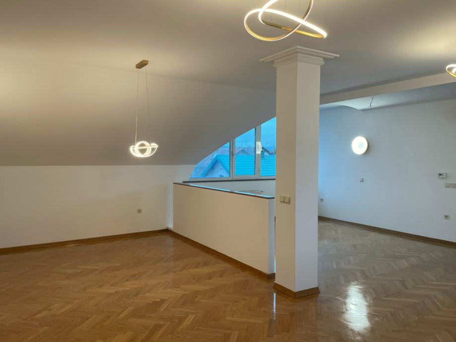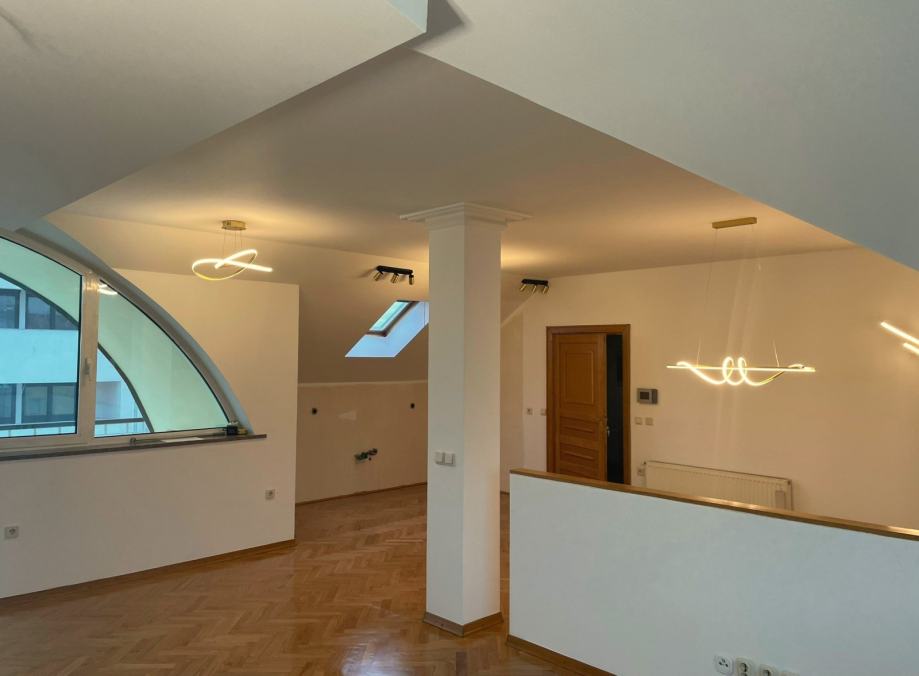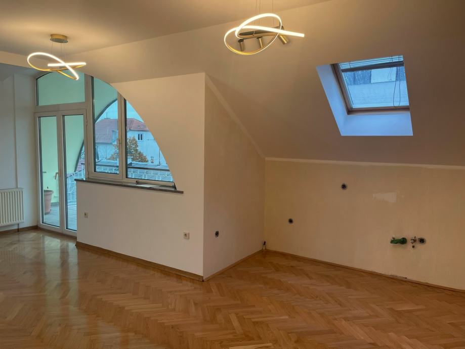 Prodaje se prostran trosobnan stan u novoj zgradi u blizini Avenije Dubrava. Nalazi se na drugom katu, ujedno i potkrovlju zgrade s klasičnim kosim krovom s crijepom. Sastoji se od open space kuhinje, blagovaonice i dnevnog boravka s izlazom na terasu. Spavaći dio je odvojen manjim hodnikom u kojemu se nalaze dvije spavaće sobe s krovnim prozorima, kupaonica s kadom i odvojen toalet. Stropovi su visoki i djelomično pod kosinama, što u kombinaciji s velikim prozorima daje puno svjetla i osjećaj prostranosti. Parketi su hrastovi, novo obrušeni i lakirani. Nutarnja stolarija je kvalitetna drvena, a vanjska je višeslojna aluminijska rađena po mjeri. Zanimljiv je njihov oblik, koji maksimalno iskorištava svjetlost dajući osjećaj ateljea i suvremenog prostora.