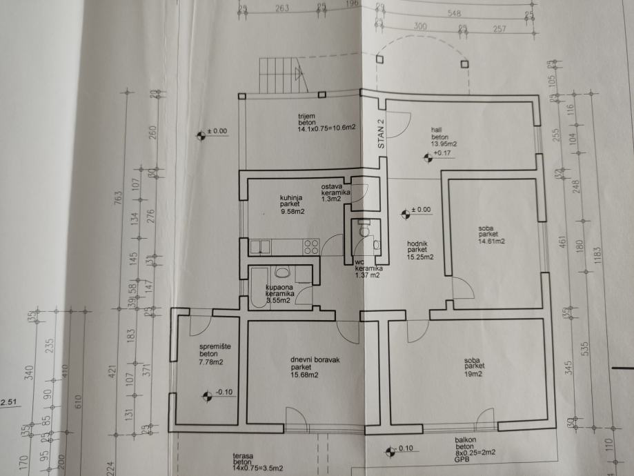 Sastoji se od ukupno tri sobe, kuhinje, wc-a, kupaonice i ostave. Površina stana je 94,09m2, površina terase je 21,75m2, te spremišta 7,78m2.