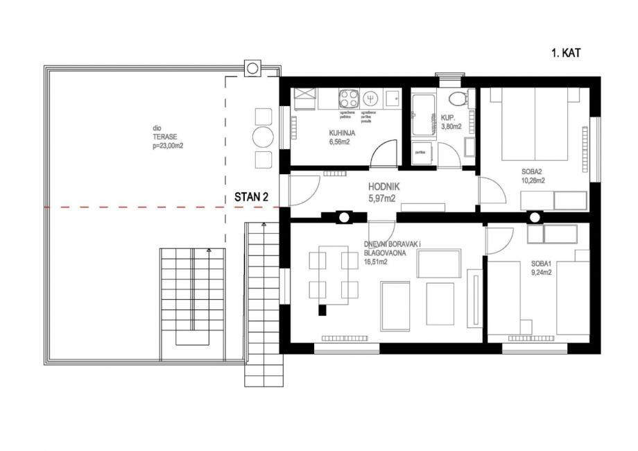 Sastoji se od dnevnog boravka i blagovaonice, odvojene kuhinje, 2 spavaće sobe, kupaonice, hodnika te prostrane vanjske terase (djelomično natkrivene) od 23m2.