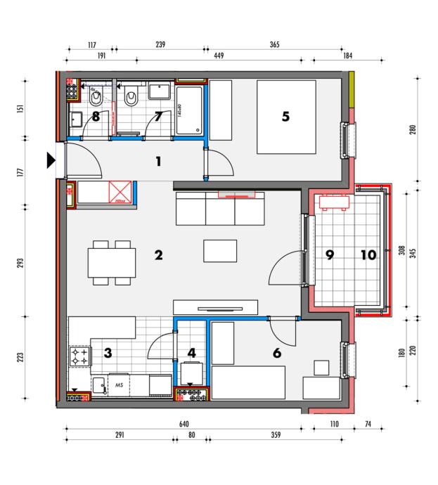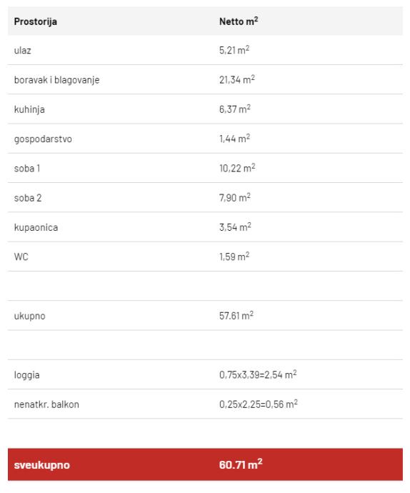 U ponudi su dvosobni, trosobni i četverosobni stanovi, pažljivo osmišljenog tlocrta. Svaki stan ima i otvoreni prostor (loggiu, balkon ili terasu) te pripadajuće spremište i parkirno mjesto u podrumskoj garaži.