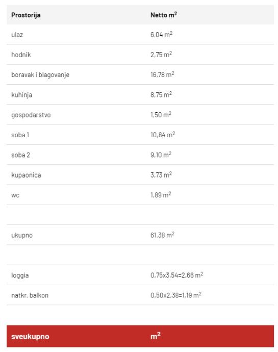Hodna obloga: parket višeslojni hrastov parket u sobama i hodniku, keramičke pločice u kuhinjama, sanitarijama i spremištima te protuklizne keramičke pločice na loggiama, balkonima i terasama