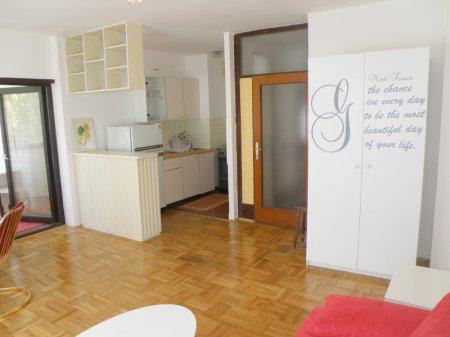 Stan se sastoji od ulaznog dijela (predsoblja), kupaone s wc-om, kuhinje kao dijela prostrane sobe s ležajem koji se razvlači velikim ormarom. U stanu svu svi potrebiti uređaji. Orijentacija zapad, na krasan park, zelenilo i drvored.