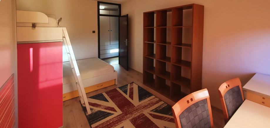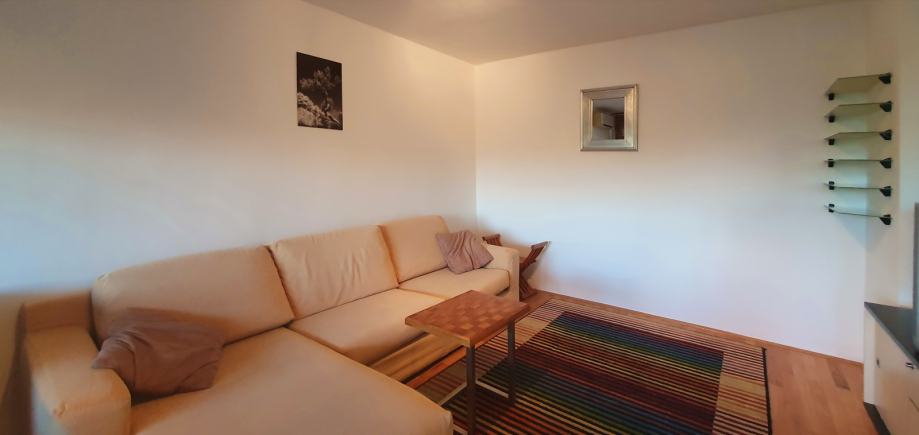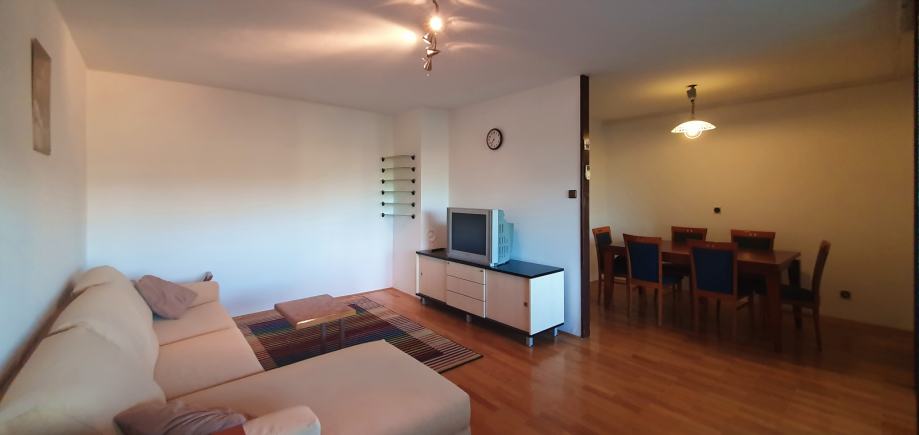 Dnevni dio odijeljen je od ostalog dijela stana te se sastoji od ulaznog hodnika, prostranog dnevnog boravka i blagovaone iz kojeg se ulazi u zasebnu kuhinju te natkriveni balkon. U drugom dijelu stana su dvije spavaće sobe solidne veličine, kupaonica s wc-om, zasebnim toaletom i smočnicom.