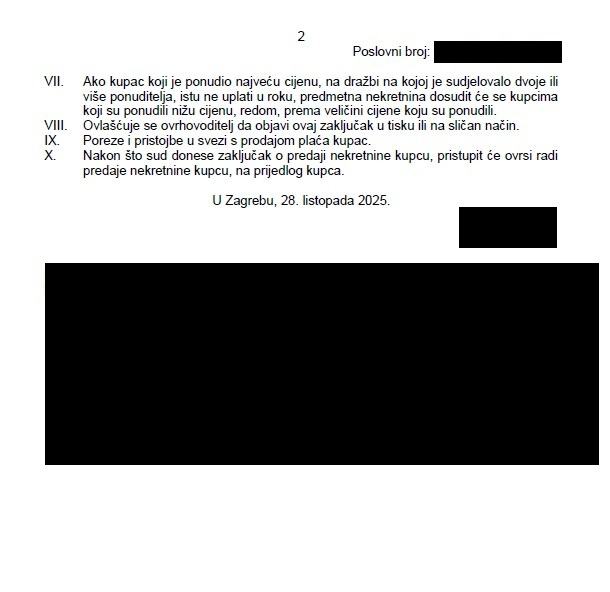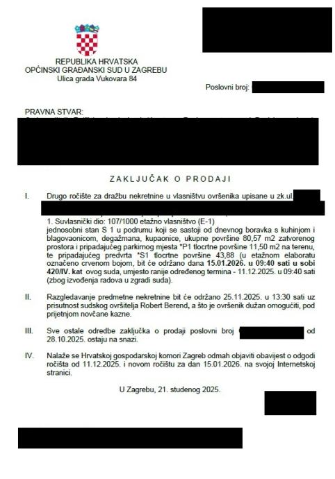 Određuje se ročište za dražbu dana 15.01.2026. u 09:40 h. Određuje se razgledavanje predmetne nekretnine za dan 25.11.2025. u 13:30 sati.