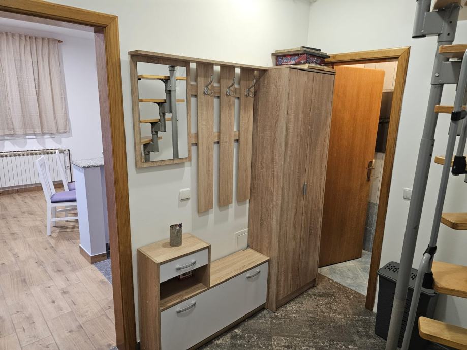 Gornja etaža čini mirnu noćnu zonu i uključuje hodnik, manju radnu sobu, kupaonicu i prostranu spavaću sobu, idealnu za udoban i miran boravak.