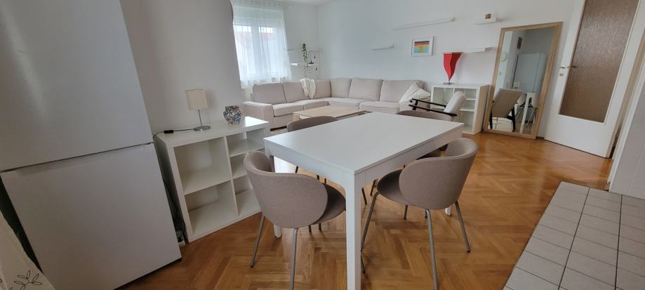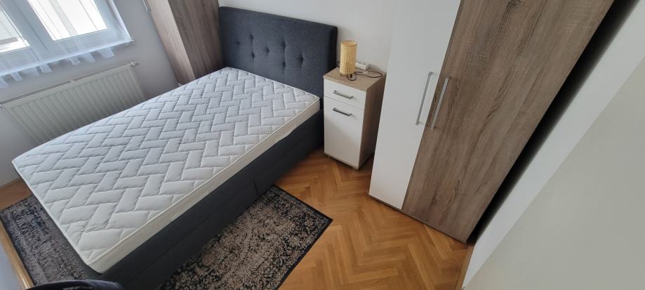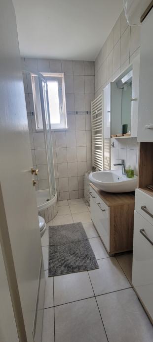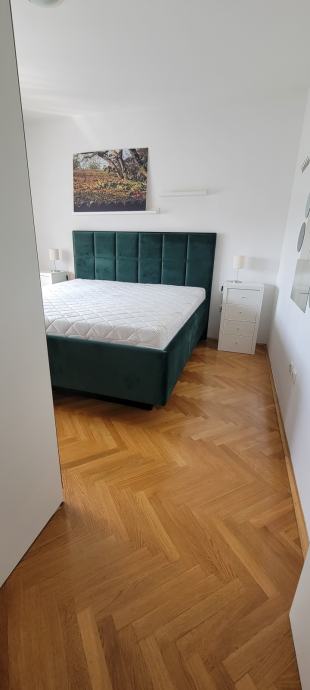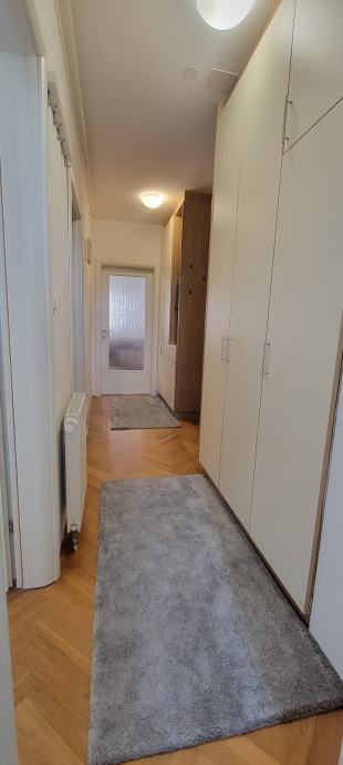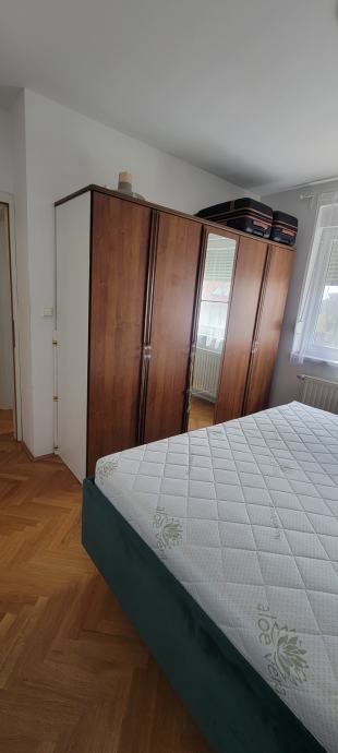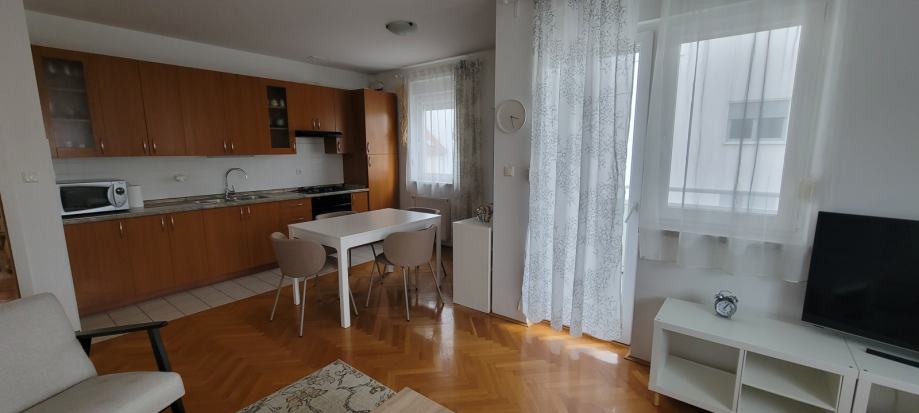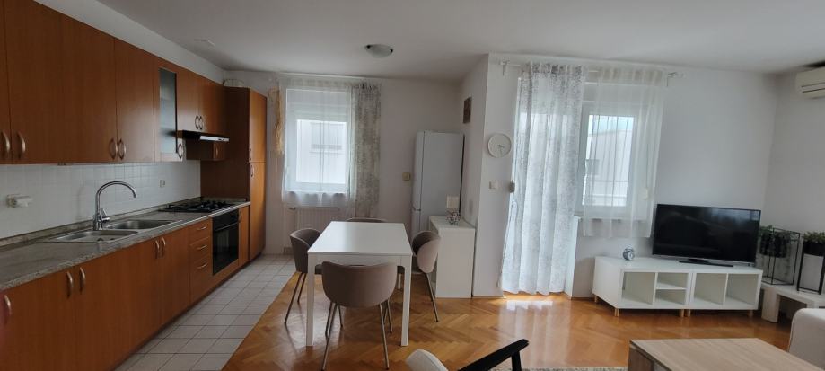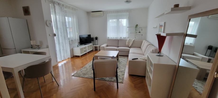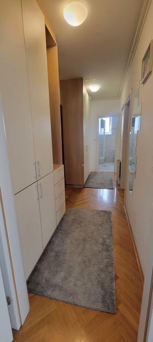 U 65m2 ulazite hodnikom opremljenim ugradbenim ormarima a onda u dvije prostrane spavace sobe te u dnevni boravak sa kuhinjom i blagovaonicom. Svi prostori su komotni, dobro osvjetljeni i opremljeni. Stan ima pripadajuce parking mjesto, izlaz na balkon, etazno plinsko i klimu, a rezije su mu povoljne ( oko 130€ ).