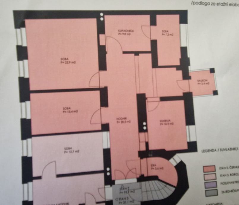 stan u prizemlju koji se sastoji od dvije sobe, kuhinje, smočnice, wc-a, kupaonice, male ostave i hodnika, u površini od 88,40 m2, koji je neodvojivo povezan sa odgovarajućim suvlasničkim djelom cijele nekretnine koji je jednako velik kao i suvlasnički dijelovi ostalih suvlasnika.