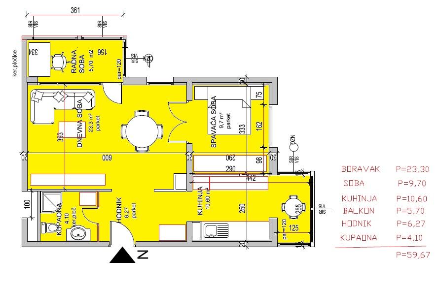 Sastoji se od ulaznog hodnika, dnevnog boravka sa blagovaonom, odvojenim radnim kutkom na zatvorenoj lođi, komforne kupaonice, spavaće sobe sa krevetom 160x200 cm.