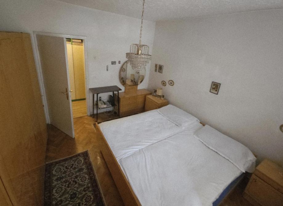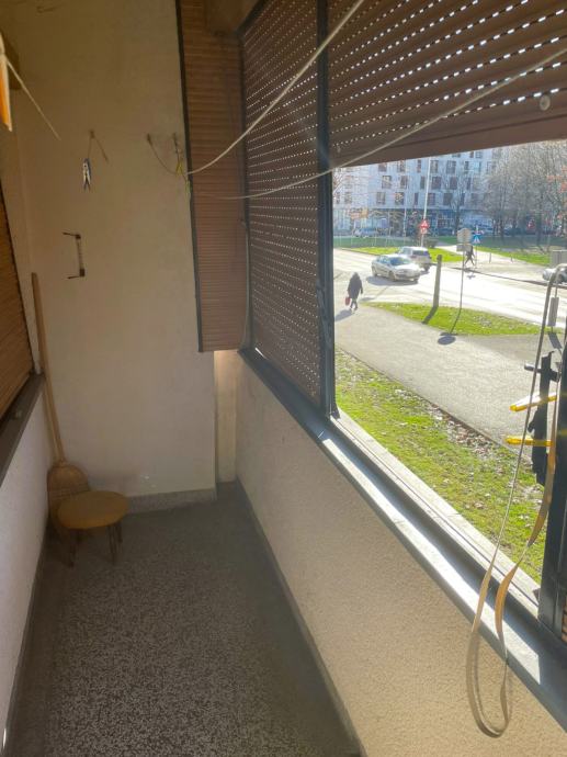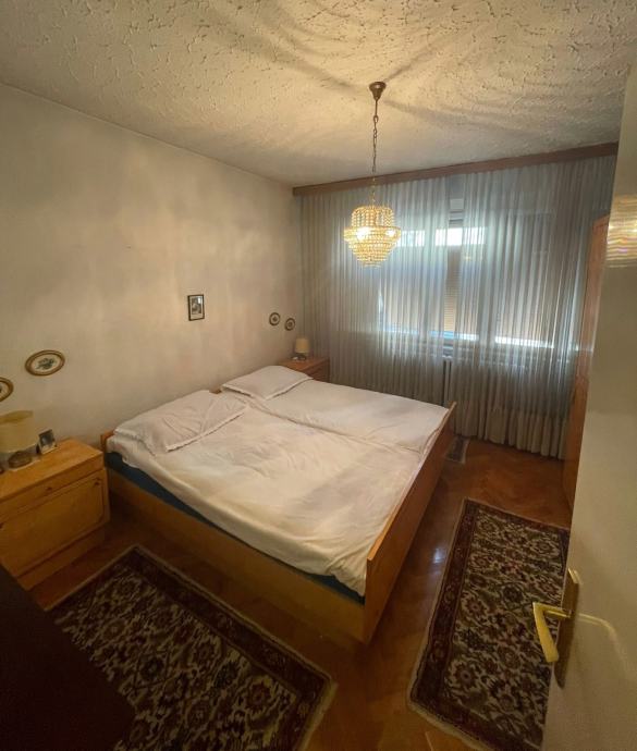 Sastoji se od ulaznog prostora, blagovaonice s kuhinjom, dvije spavaće sobe, kupaonice i lođe. Pripada mu i spremište. Orijentiran je dvostrano istok/zapad, tako da je vrlo svjetao, lagano je provjetravanje i nije nikada prevruće. Grijanje je gradskom toplanom. Stolarija je drvena i još uvijek funkcionalna, prostorije su prostrane. Stan je održavan i funkcionalan, mada bi ga trebalo osuvremeniti. Prodaje se djelomično namješten. Energetski certifikat je u izradi.