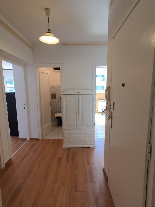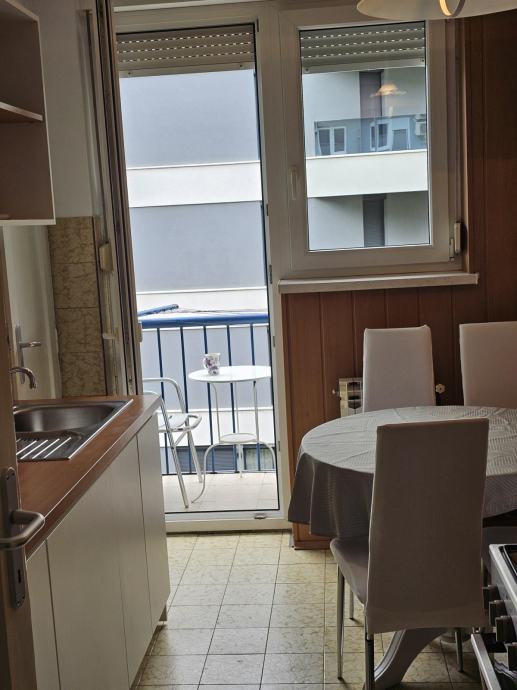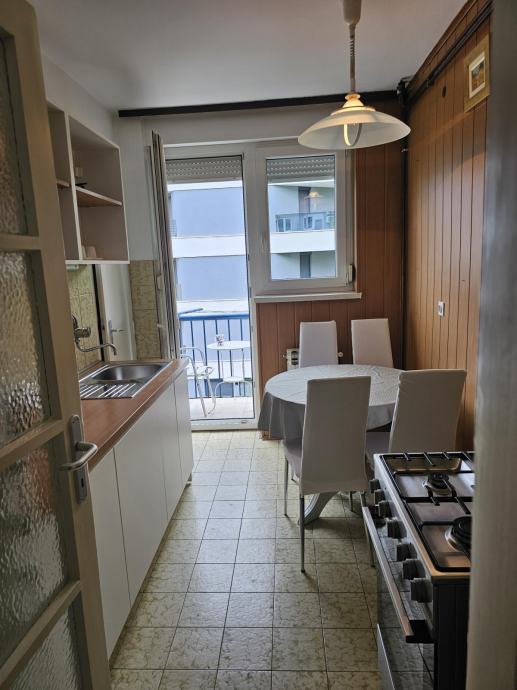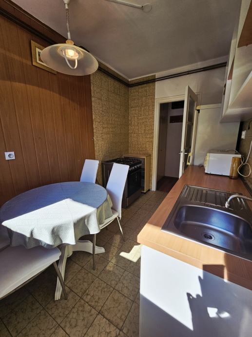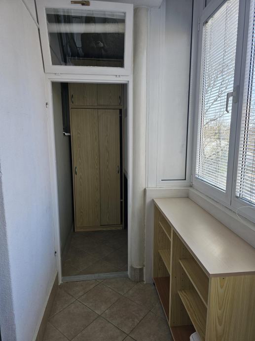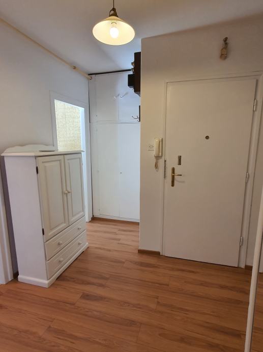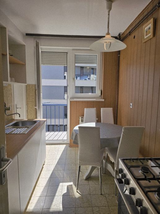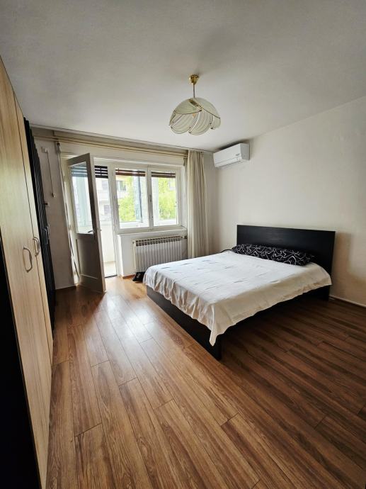 Prostran dvosobni stan, renoviran i namješten, s puno svjetla. Sastoji se od ulaznog hodnika, na desno kuhinje s izlazom na balkon i ostave. Pored kuhinje je odvojeni WC. Nasuprot ulaza su dvoja vrata koja vode u dnevni boravak te spavaću sobu iz koje se izlazi na lođu koja se proteže cijelom širinom stana. U sklopu lođe još jedna ostava. Lijevo od ulaza je kupaonica. Grijanje etažno plinsko - novi kondenzacijski bojler. Klima.