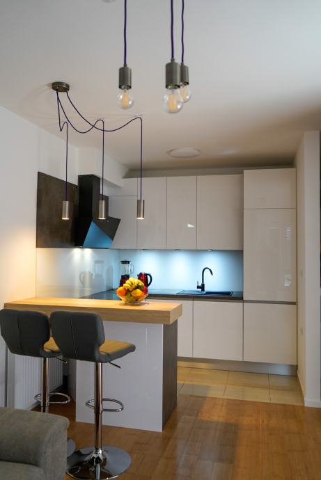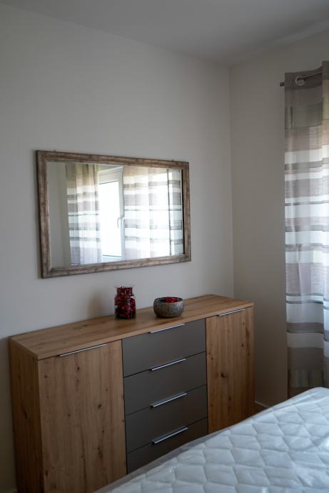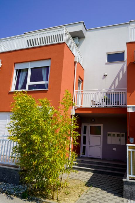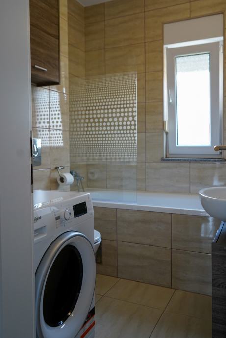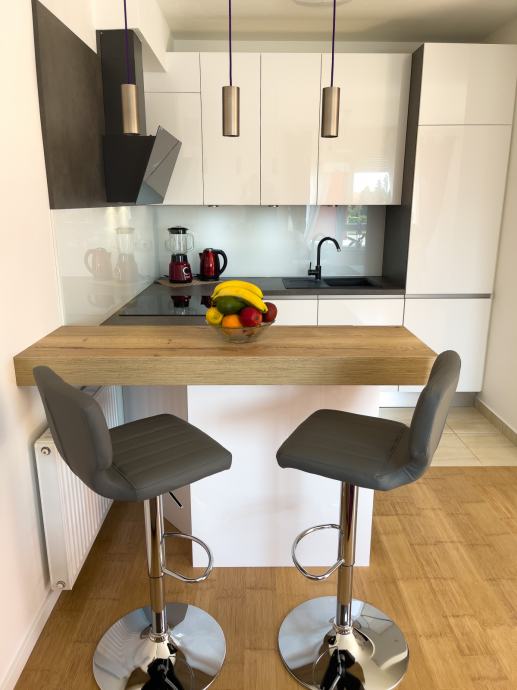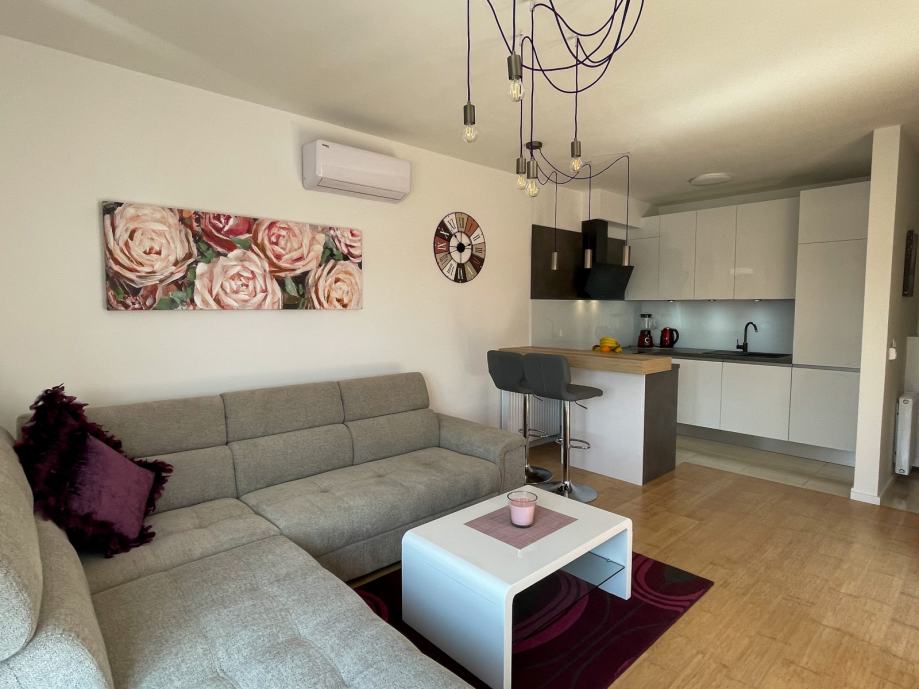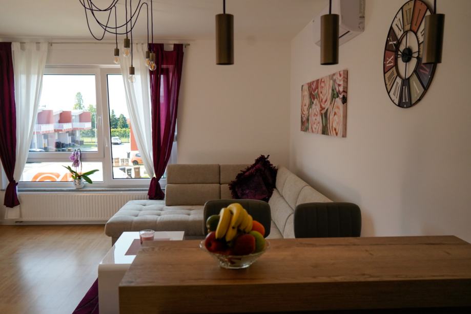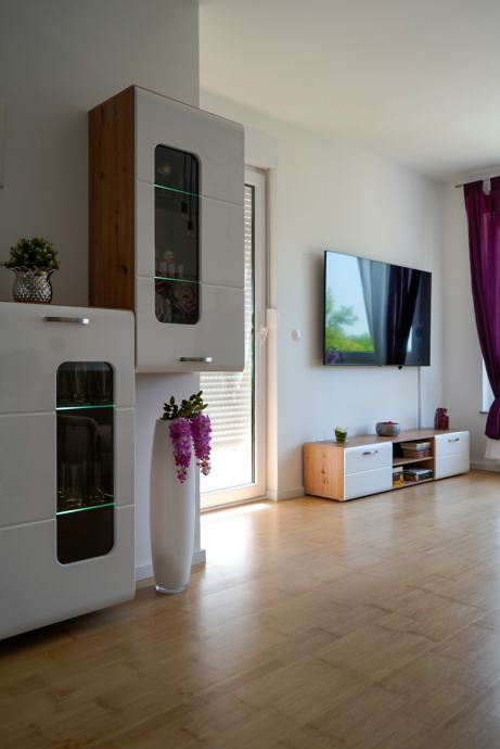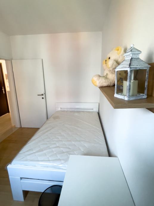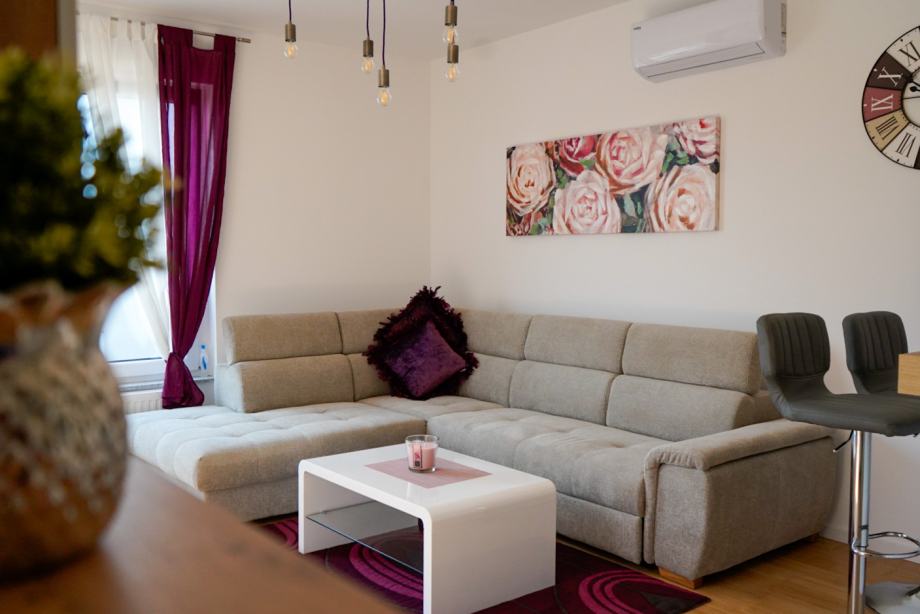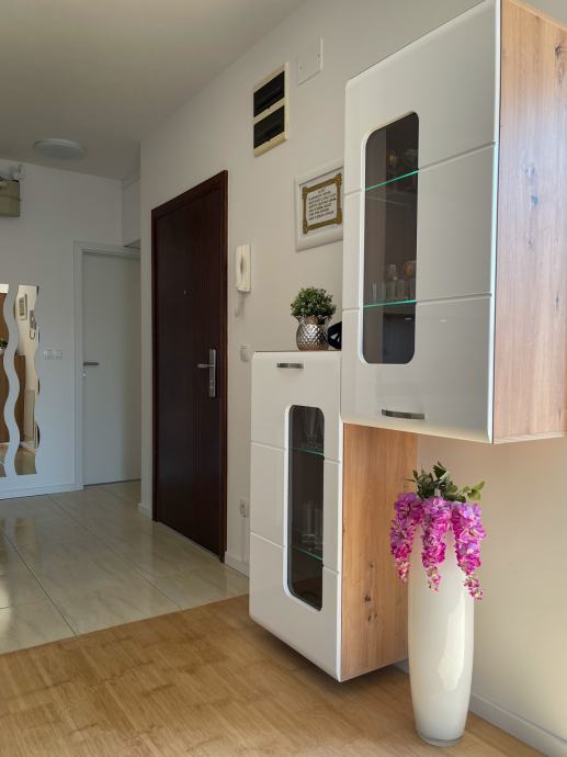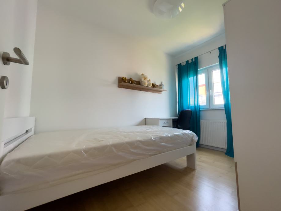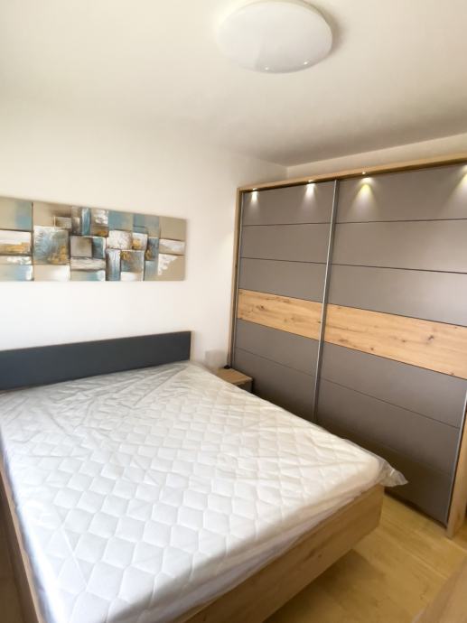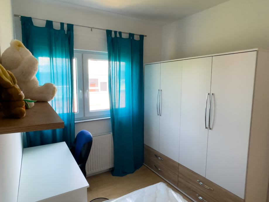 Moderan, nekorišten i luksuzno uređen trosobni stan sa parkirnim mjestom. Prvo useljenje. Orijentacija S-J. Certifikat A+ razred. Stan se nalazi na prvom katu od dva kata. Sastoji se od ulaznog hodnika, open-space dnevnog boravka sa kuhinjom te izlazom na balkon, 2 spavaće sobe, kupaonice. Dnevni boravak i balkon su orijentacija na jug tako da uvijek ima puno dnevnog svjetla. Sve prostorije imaju prozor. Iznajmljuje se sa svom opremom i namještajem ( perilica-sušilica rublja, hladnjak no-frost, ploča za kuhanje indukcija, pečnica sa pirolizom, perilica posuđa, napa, usisavač, tv 165 cm, ) Led rasvjeta, portafon, protuprovalna vrata, klima, PVC prozori, parket, WIFI + 100 TV programa opcija, etažno plinsko gijanje, vlastiti vodomjer. Jedna spavaća soba bračni krevet, druga spavača soba krevet 120x200, moguća opcija za krevet na kat po potrebi. Stan se nalazi u novom naselju zatvorenog tipa te osim stanara nema drugih osoba niti automobila te je stoga jako pogodan za djecu, izuzetno mirna i tiha lokacija, 3 stana po ulazu, mirno i na povišenom dijelu. U neposrednoj blizini škola, vrtić, autobusna linija 278 – 5 min., autobusna linija 269 – 10 min., čvor za obilaznicu te se vrlo brzo dolazi u bilo koji dio grada. Jedna strana naselja omeđena šumom pa je osječaj kao da ste u prirodi, odmor za oči, tijelo i dušu nakon gradske vreve.