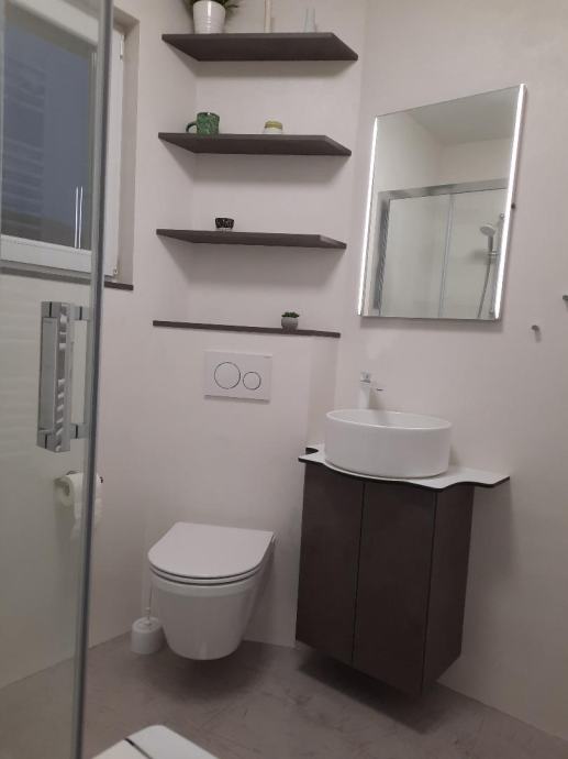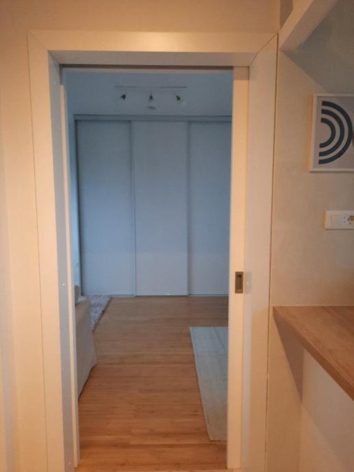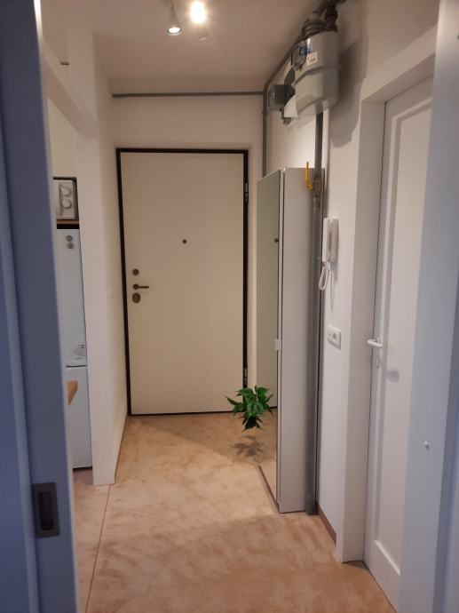 Grijanje je plinsko etažno i stan ima klimu. Kuhinja je potpuno namještena s posuđem, perilicom posuđa, napom i mikrovalnom. Kuhinja i kupaonica umjesto pločica na podu i zidovima imaju mikrocementni premaz. Na podu u sobi je parket od bambusa. U sobi se nalazi dugački ugradbeni ormar, jednostruki krevet s dodatnim ležajem, dvosjed na razvlačenje i mali radni stol.