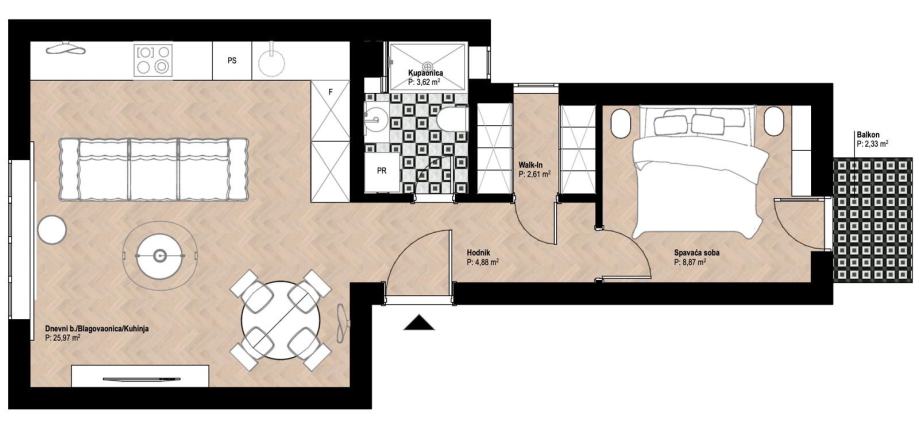 Stan je trenutno u procesu renovacije, a zavrsetak radova je predviden krajem 2025. godine. Renovacija ce biti izvedena temeljito, ukljucujuci sve instalacije, podove, zidove i stolariju. Od opreme i materijala stan ce imati hrastove parkete prve klase, boutique talijansku keramiku 41zero42 (kao na slici), Grohe podzbukne slavine u hard graphite boji, Aquaestil, Tece, Vaillant kondenzacijski bojler, itd.