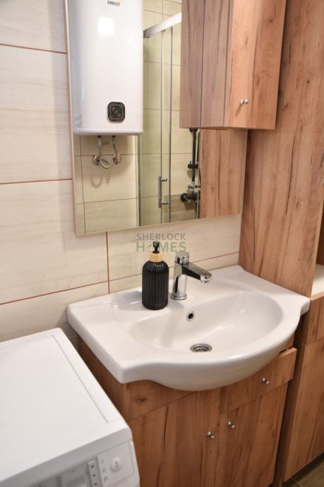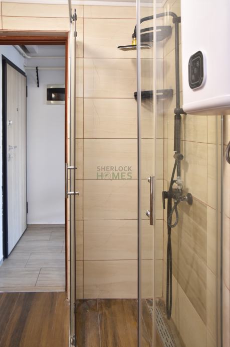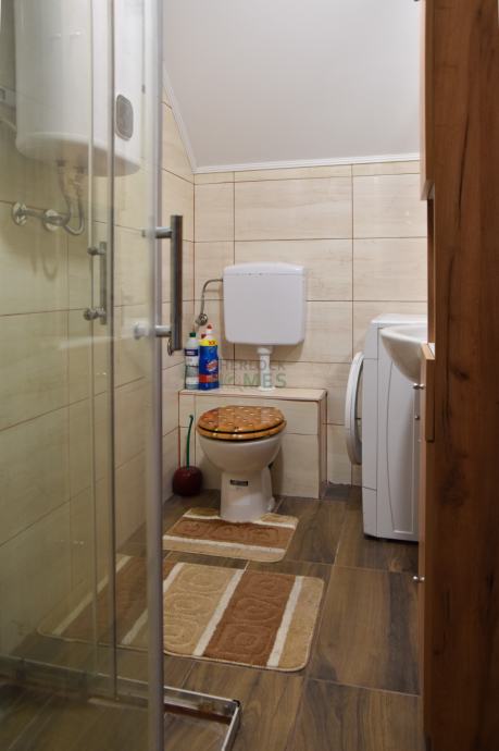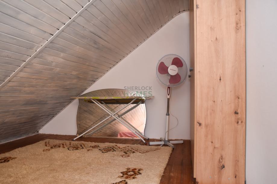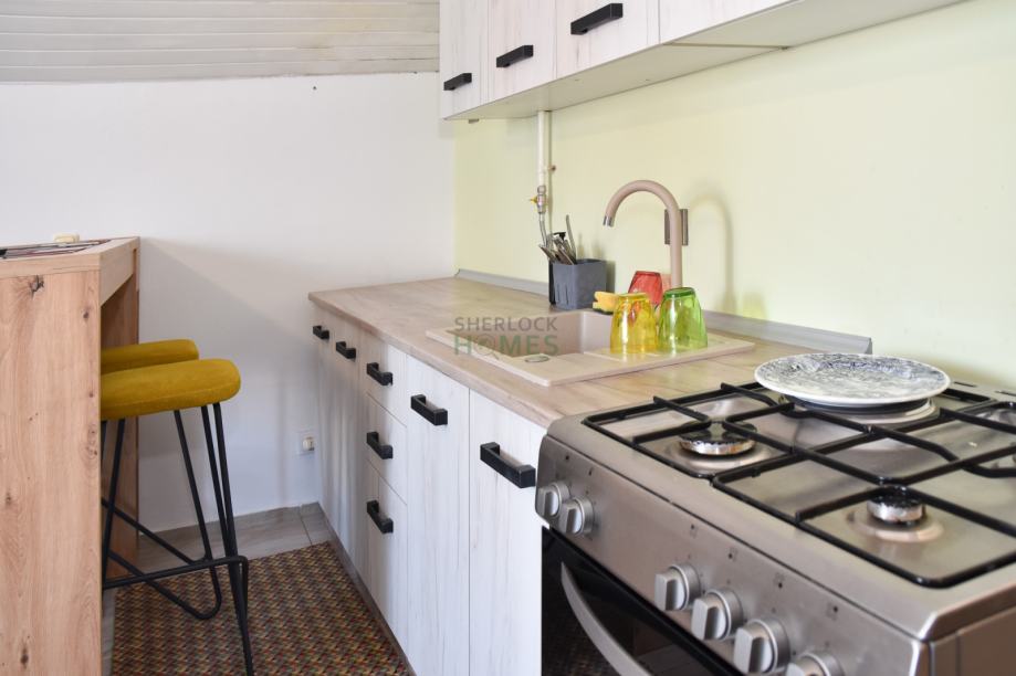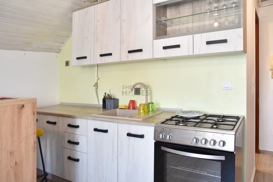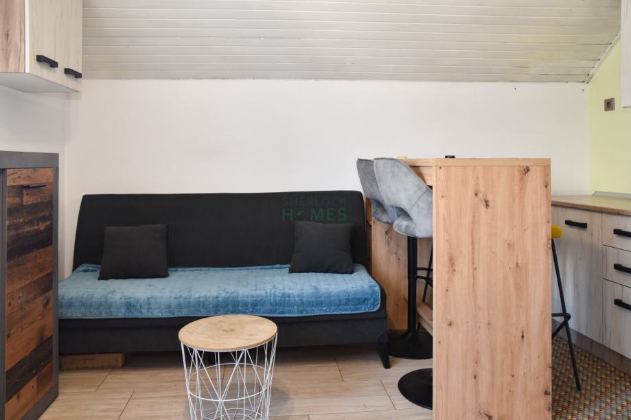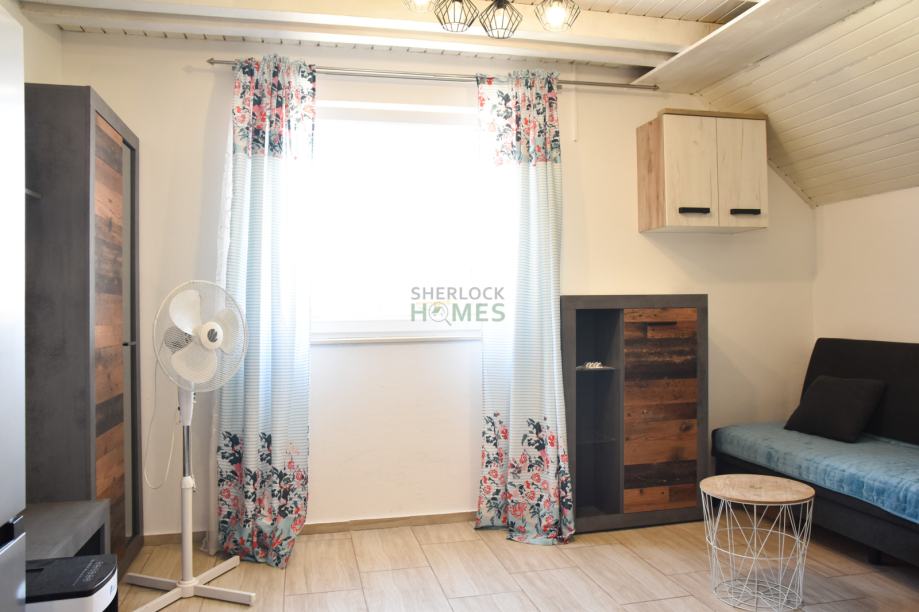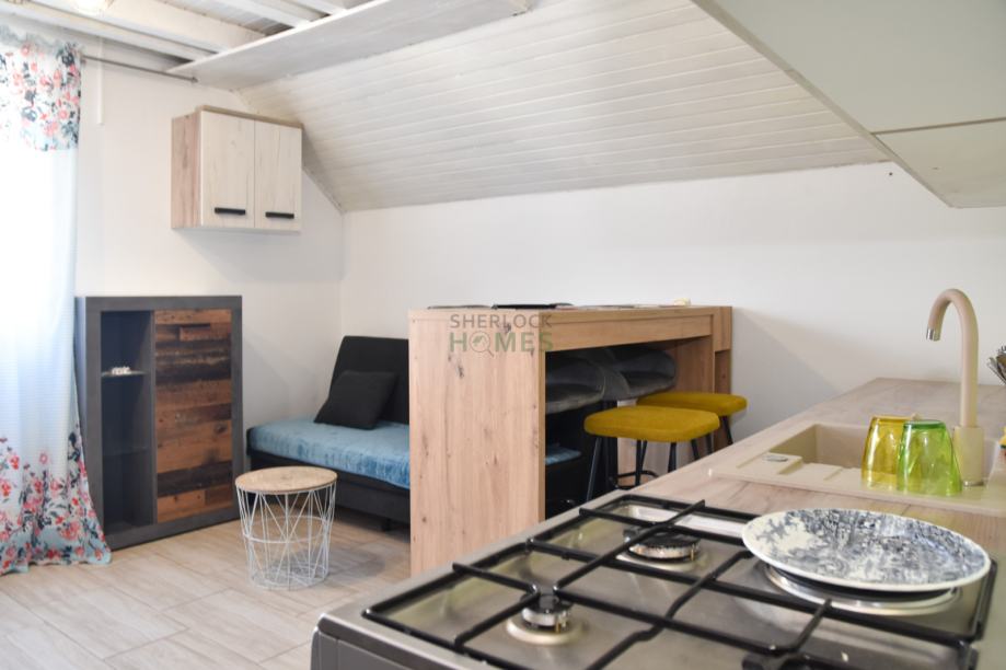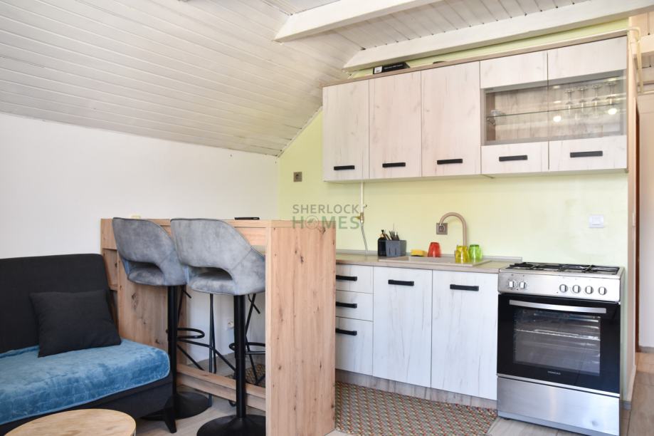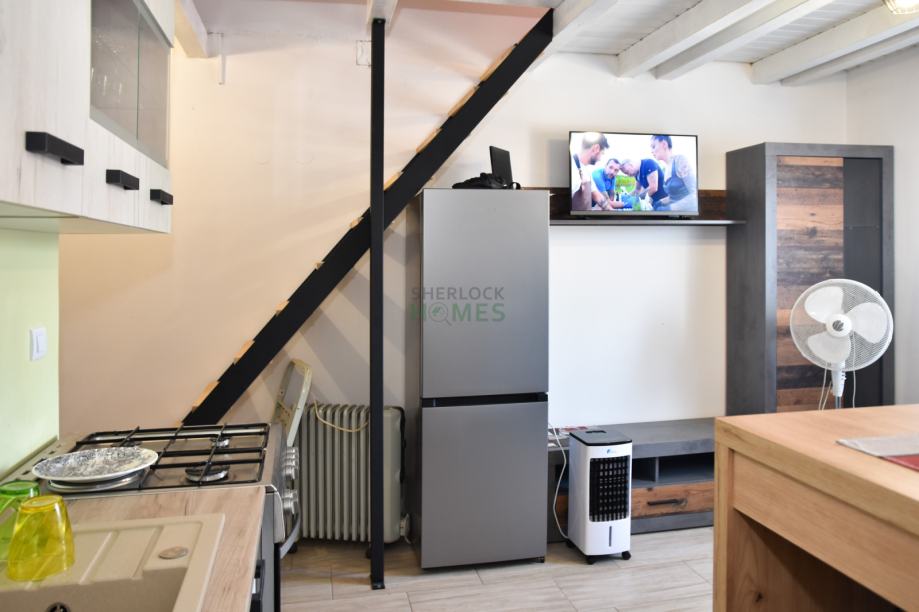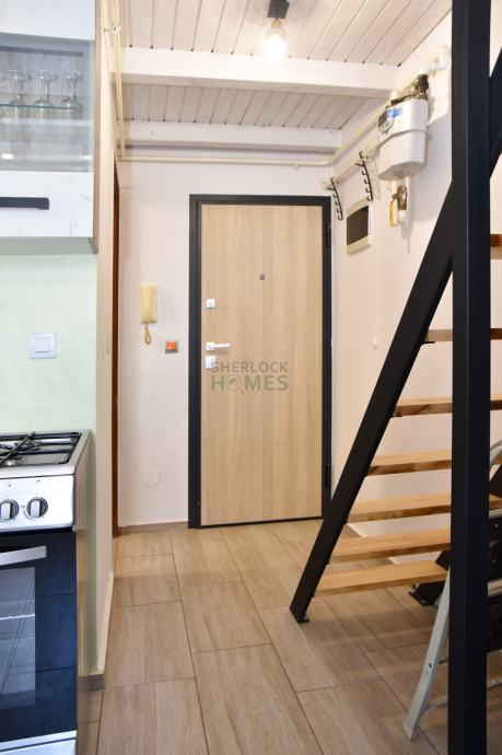 Stan je u potkrovlju zgrade. Stan se sastoji od ulaznog dijela, kupaonice sa wc-om, kuhinje i blagovaone/dnevnog boravka iz kojeg se ide na gornju etažu gdje je smješten krevet i garderoba. Ukupno donji dio 20m2 te spavaći dio 12 m2. Stan je ove godine renoviran u potpunosti. Uređeni podovi, kupaonica i wc, nova kuhinja, nova protuprovalna vrata. Svi aparati su novi u stanu. Stan se prodaje namješten.