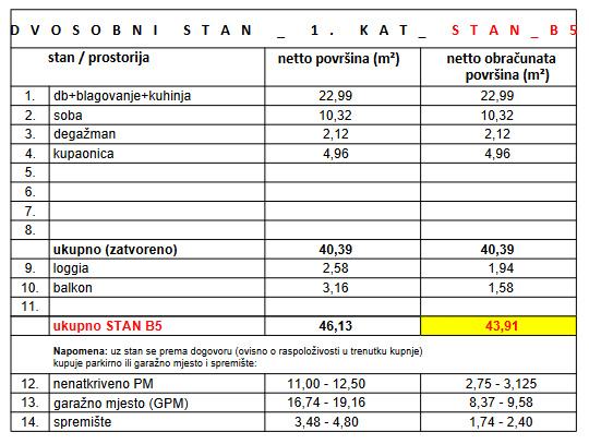 Projekat obuhvaća dvije stambene zgrade (Zgrada A i Zgrada B), koje se sastoje od podruma, prizemlja, 1. kata i 2. uvučenog kata, te imaju ukupno tri nadzemne etaže. U podrumu, iz kojega postoji ulaz u obje Zgrade, smješteno je ukupno 9 garažnih parkirališnih mjesta (GPM), te ukupno 13 spremišta stanara. U etaži prizemlja predviđeno je 10 nenatkrivenih parkirališnih mjesta (PM). U nadzemnim etažama od prizemlja do uvučenog kata svaka Zgrada ima po 8 stambenih jedinica, pružajući ukupno 16 stambenih jedinica u obje Zgrade.
