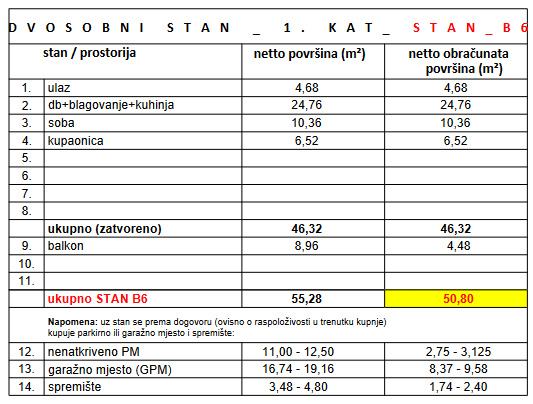 Projekat obuhvaća dvije stambene zgrade (Zgrada A i Zgrada B), koje se sastoje od podruma, prizemlja, 1. kata i 2. uvučenog kata, te imaju ukupno tri nadzemne etaže. U podrumu, iz kojega postoji ulaz u obje Zgrade, smješteno je ukupno 9 garažnih parkirališnih mjesta (GPM), te ukupno 13 spremišta stanara. U etaži prizemlja predviđeno je 10 nenatkrivenih parkirališnih mjesta (PM). U nadzemnim etažama od prizemlja do uvučenog kata svaka Zgrada ima po 8 stambenih jedinica, pružajući ukupno 16 stambenih jedinica u obje Zgrade.