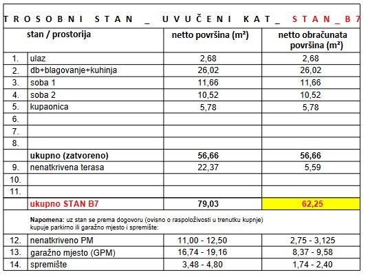 Projekat obuhvaća dvije stambene zgrade (Zgrada A i Zgrada B), koje se sastoje od podruma, prizemlja, 1. kata i 2. uvučenog kata, te imaju ukupno tri nadzemne etaže. U podrumu, iz kojega postoji ulaz u obje Zgrade, smješteno je ukupno 9 garažnih parkirališnih mjesta (GPM), te ukupno 13 spremišta stanara. U etaži prizemlja predviđeno je 10 nenatkrivenih parkirališnih mjesta (PM). U nadzemnim etažama od prizemlja do uvučenog kata svaka Zgrada ima po 8 stambenih jedinica, pružajući ukupno 16 stambenih jedinica u obje Zgrade.