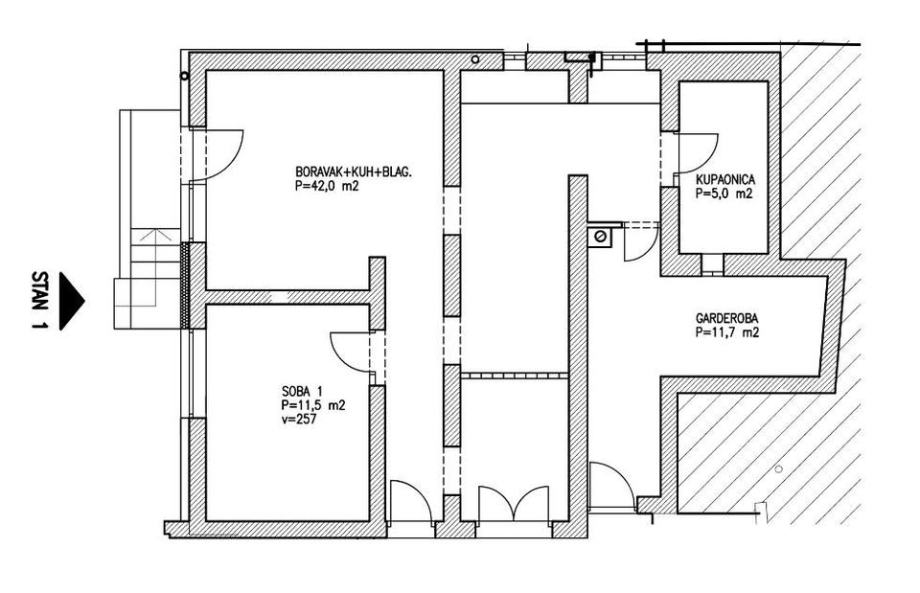 Stan je pogodan za poslovni prostor ili stanovanje. Sastoji se od dnevnog boravka, kuhinje i blagovaonice, zasebne spavaće sobe, male sobice, kupaonice i garderobe/spremišta.