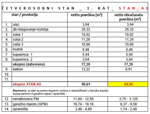 Projekat obuhvaća dvije stambene zgrade (Zgrada A i Zgrada B), koje se sastoje od podruma, prizemlja, 1. kata i 2. uvučenog kata, te imaju ukupno tri nadzemne etaže. U podrumu, iz kojega postoji ulaz u obje Zgrade, smješteno je ukupno 9 garažnih parkirališnih mjesta (GPM), te ukupno 13 spremišta stanara. U etaži prizemlja predviđeno je 10 nenatkrivenih parkirališnih mjesta (PM). U nadzemnim etažama od prizemlja do uvučenog kata svaka Zgrada ima po 8 stambenih jedinica, pružajući ukupno 16 stambenih jedinica u obje Zgrade.