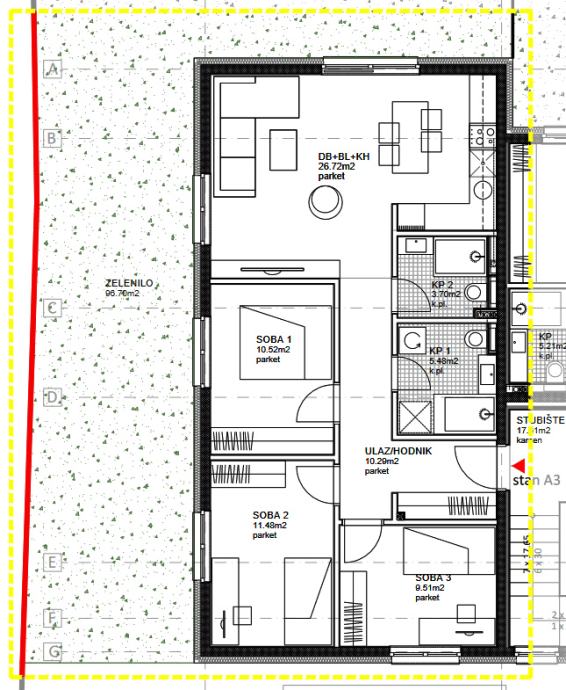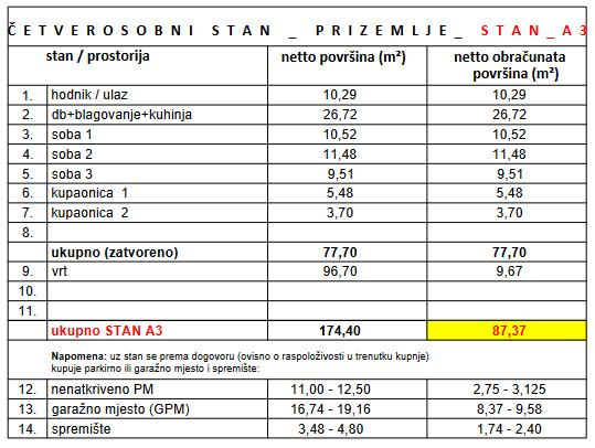 Projekat obuhvaća dvije stambene zgrade (Zgrada A i Zgrada B), koje se sastoje od podruma, prizemlja, 1. kata i 2. uvučenog kata, te imaju ukupno tri nadzemne etaže. U podrumu, iz kojega postoji ulaz u obje Zgrade, smješteno je ukupno 9 garažnih parkirališnih mjesta (GPM), te ukupno 13 spremišta stanara. U etaži prizemlja predviđeno je 10 nenatkrivenih parkirališnih mjesta (PM). U nadzemnim etažama od prizemlja do uvučenog kata svaka Zgrada ima po 8 stambenih jedinica, pružajući ukupno 16 stambenih jedinica u obje Zgrade.