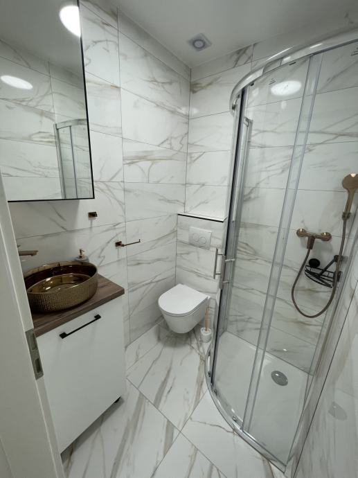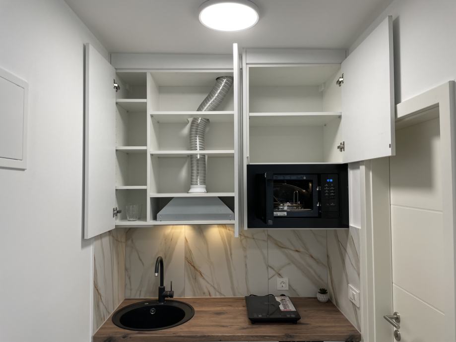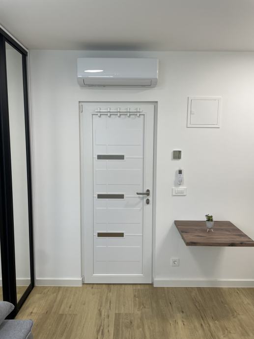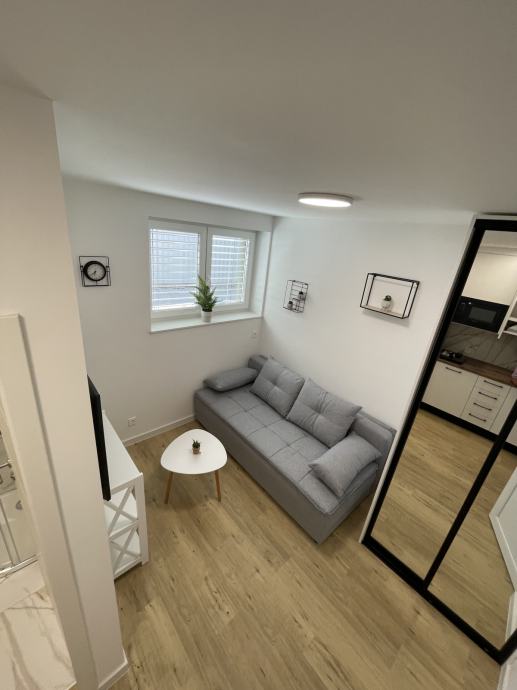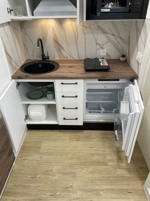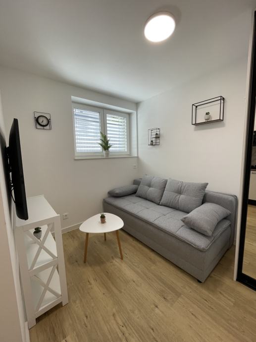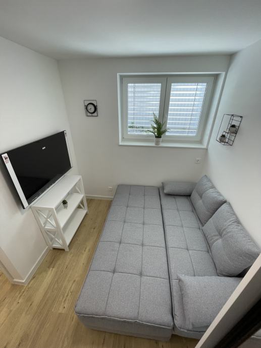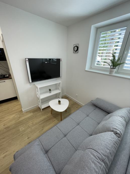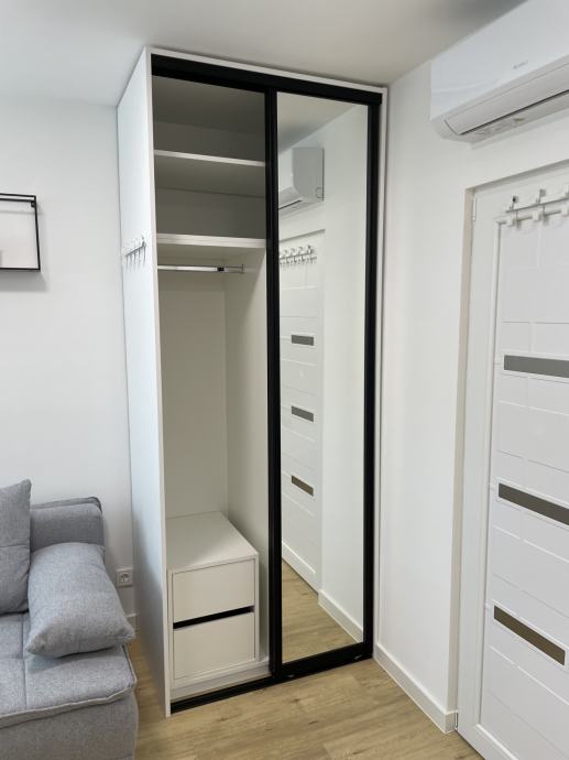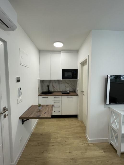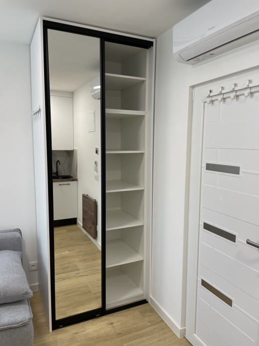 Garsonijera je potpuno namještena za ugodno stanovanje, ležaj na razvlačenje (180x200)i dosta garderobnog prostora. Kuhinja opremljena frižiderom,mini pločom za kuhanje,napom.Podno grijanje, klima uređaj/hlađenje/grijanje,električne žaluzine perilica i sušilica rublja.