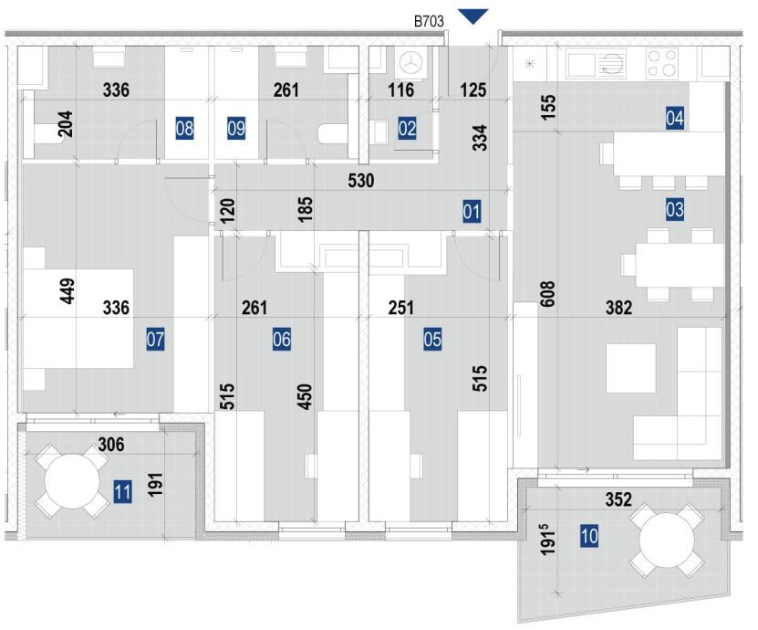 Stan se sastoji od hodnika, kuhinje, vešeraj, blagovaonice, dnevnog boravka, 2 dječje te 1 bračnom spavaćom sobom. Bračna soba ima izlaz na svoju loggiu te jedno od kupatila (s tuš kabinom).