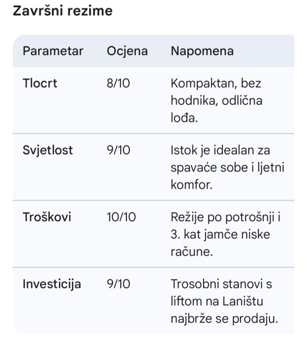 Evo cjelokupne i ujedinjene analize tvog potencijalnog stana na Laništu. Kada se povežu tlocrt, tehničke karakteristike zgrade i istočna orijentacija, dobivamo vrlo jasnu sliku.