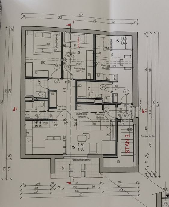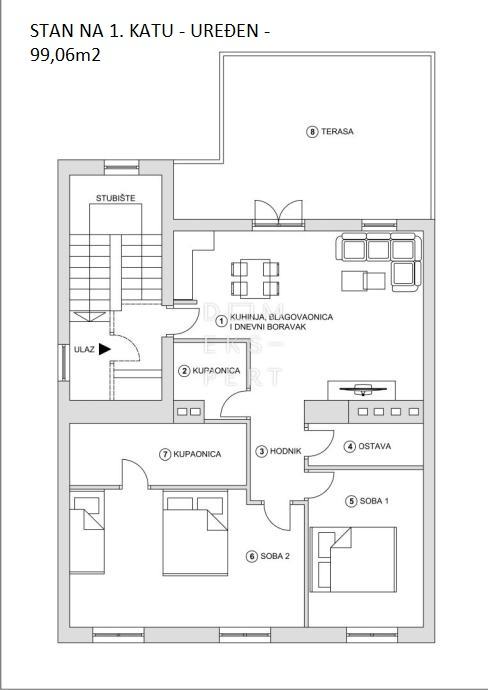 Površina uređenog stana na 1.katu iznosi netto 87.82 m2, a sastoji se od: