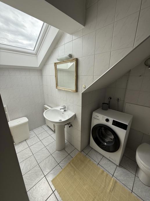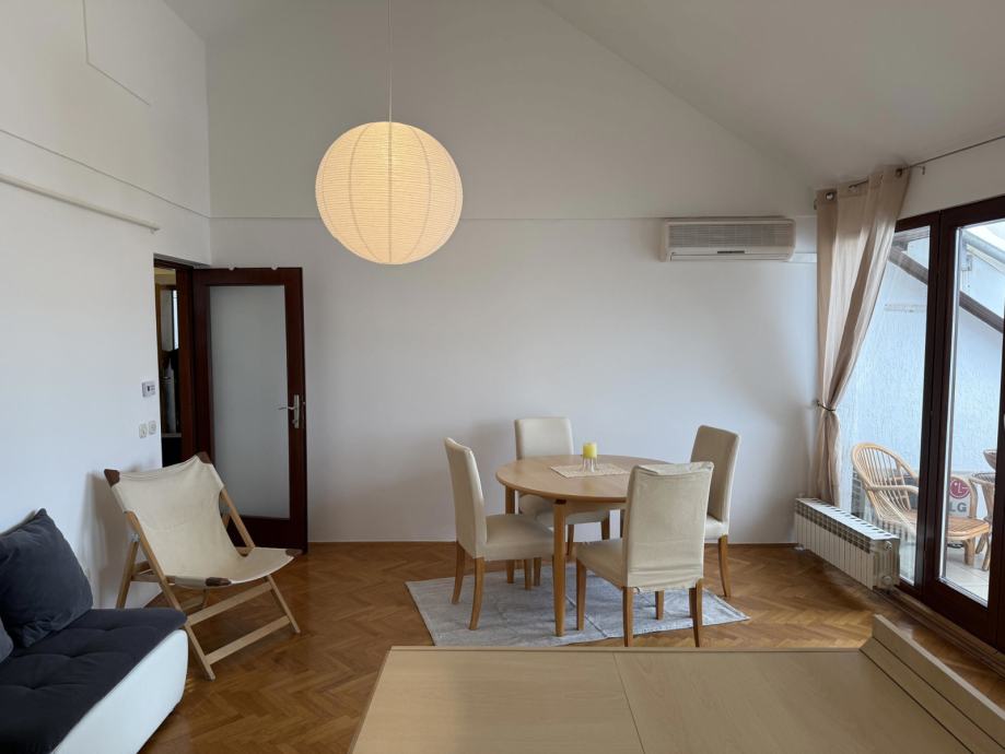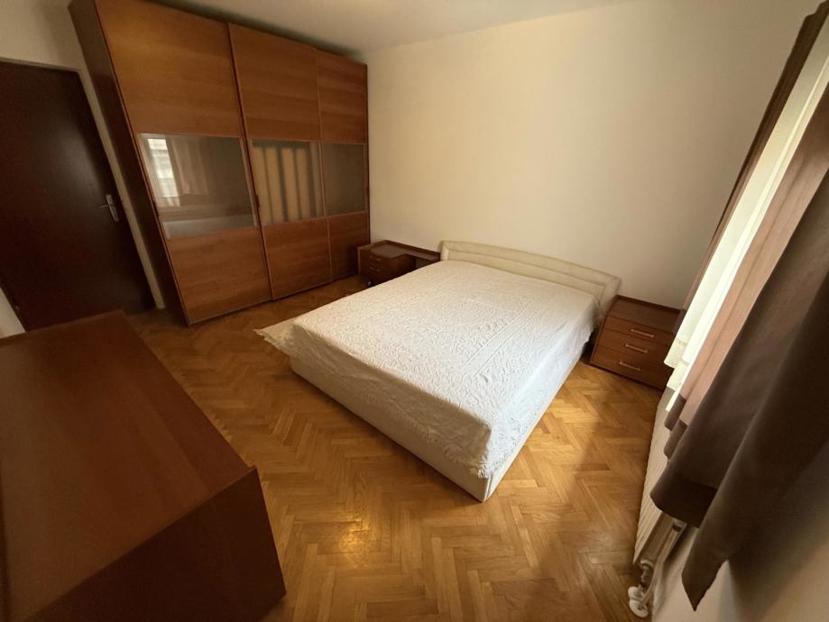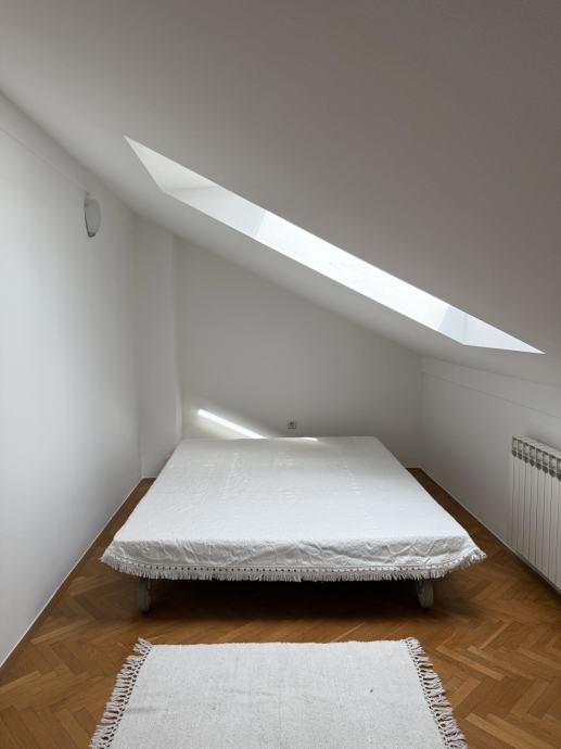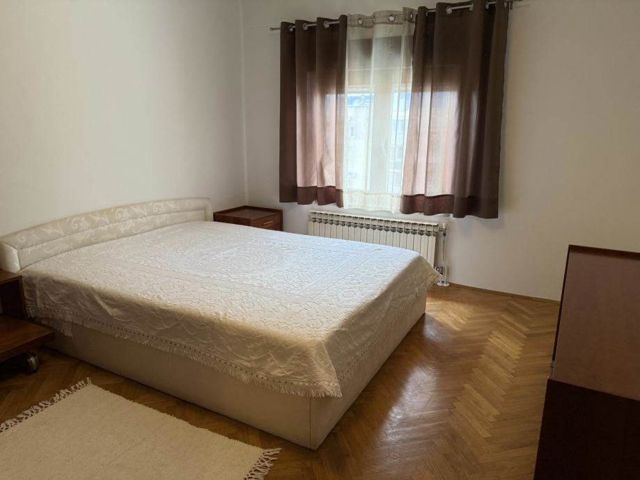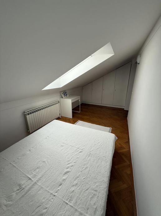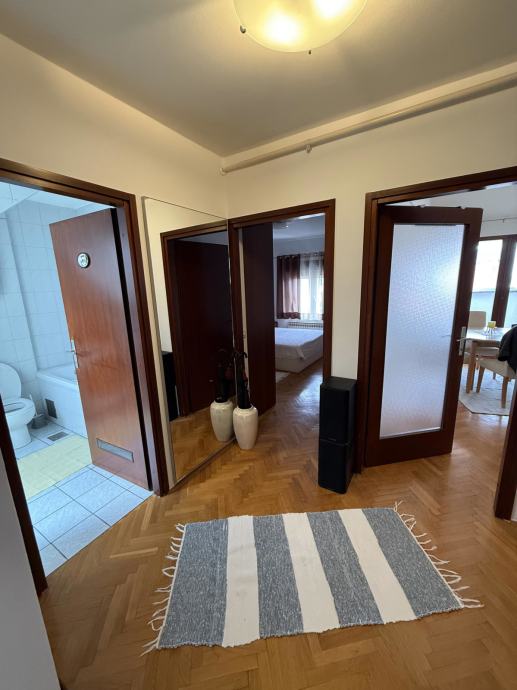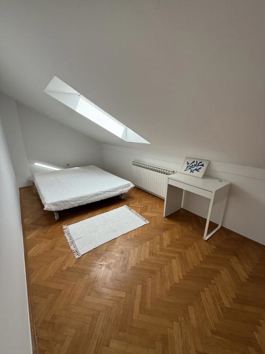 Iznajmljuje se prostran i svijetao stan površine 82 m² na 5. katu stambene zgrade iz 1995. godine (zgrada nema lift). Stan se sastoji od dvije spavaće sobe, velikog dnevnog boravka povezanog s kuhinjom i blagovaonicom, kupaonice (WC) i male lođe okrenute na sjever.