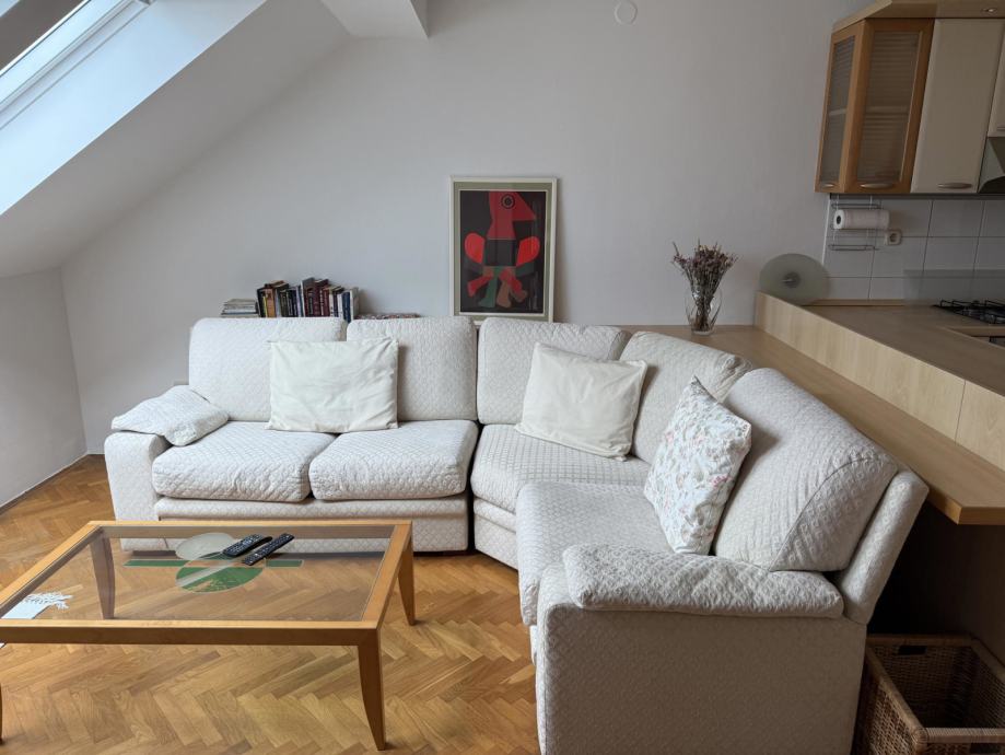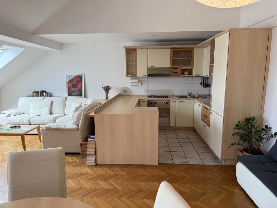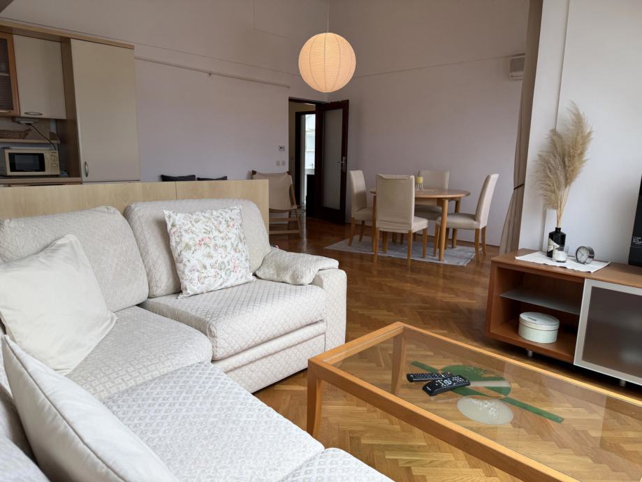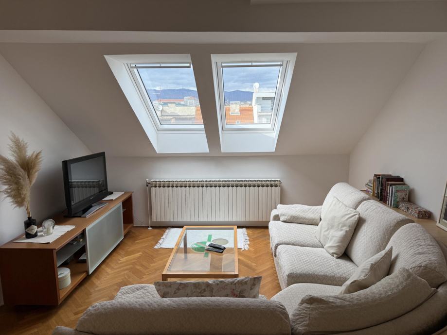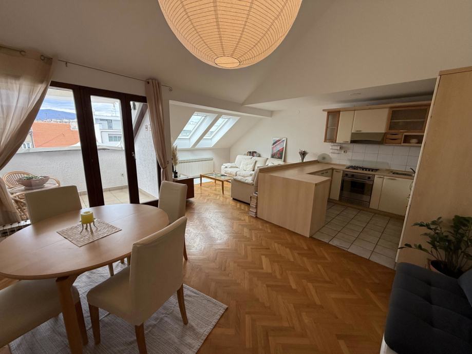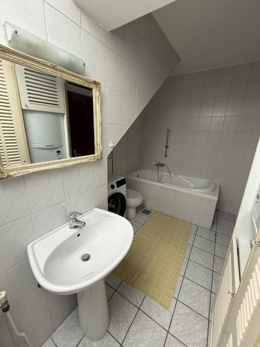 Iznajmljuje se prostran i svijetao stan površine 82 m² na 5. katu stambene zgrade iz 1995. godine (zgrada nema lift). Stan se sastoji od dvije spavaće sobe, velikog dnevnog boravka povezanog s kuhinjom i blagovaonicom, kupaonice (WC) i male lođe okrenute na sjever.
