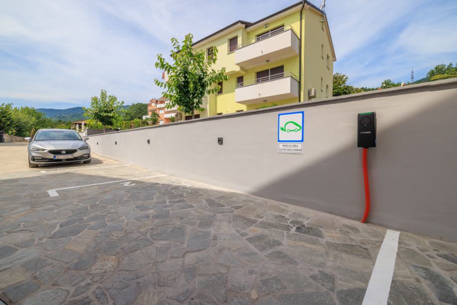 Pripadajuće parkirno mjesto ispred kuće. Opremljen je klima uređajem (grijanje/hlađenje),perilica i sušilica/vešeraj ,TV, wi fi, elektro punjač za vozila....