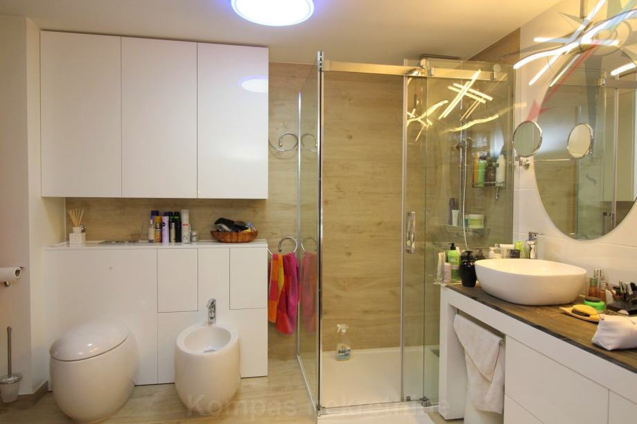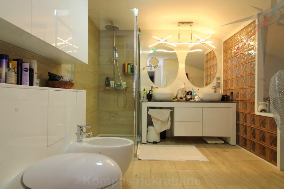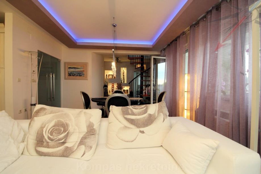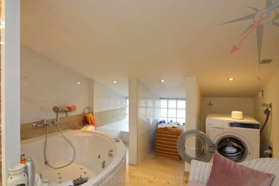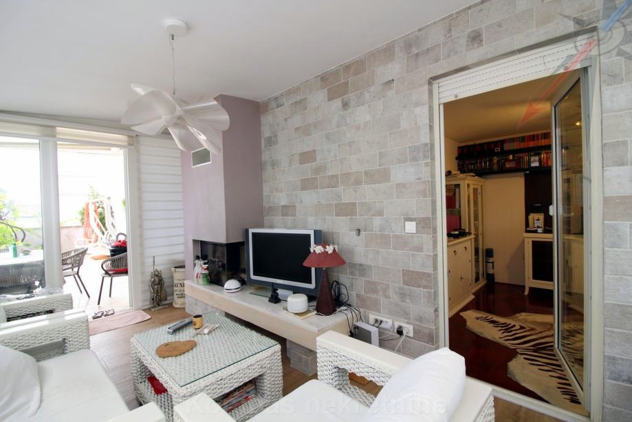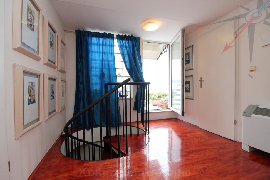 DONJA ETAŽA: hodnik, dnevni boravak, kuhinja, soba, kupaonica, podne površine 68,74 m² i terase podne površine 25,66 m². Dio terase je natkriven, a dio je zatvoren u mali zimski vrt sa kaminom.
