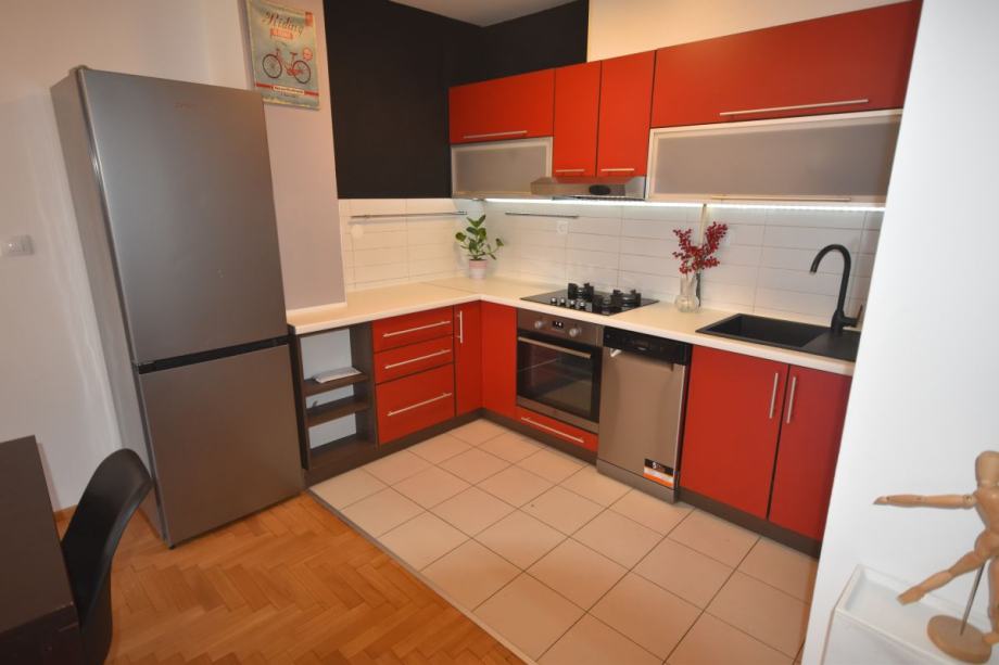 U potpunosti je namješten i opremljen (perilica rublja i posuđa, posuđe, posteljina i ručnici)