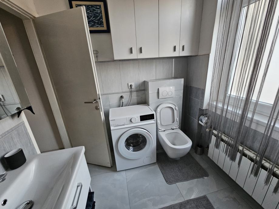 Stan je potpuno opremljen novim namještajem i uređajima: perilica rublja, perilica posuđa, mikrovalna, optički internet, MAX TV, LED TV od 55 inča te blindo vrata za dodatnu sigurnost.