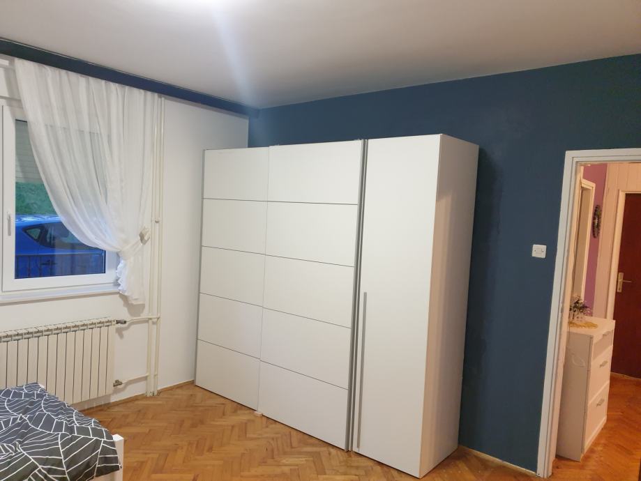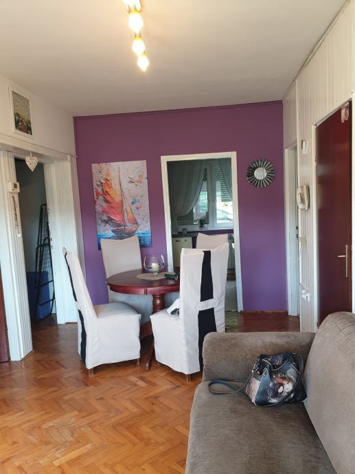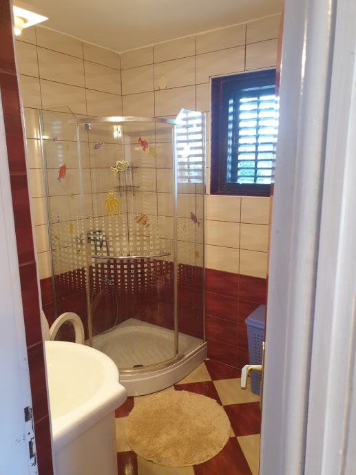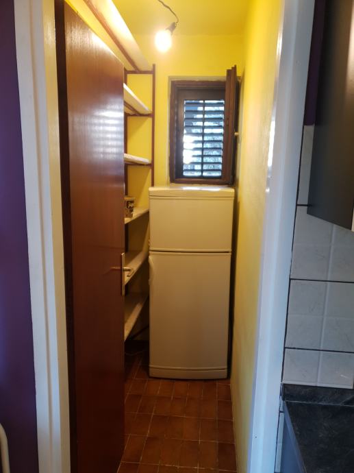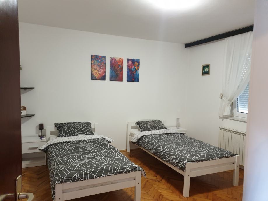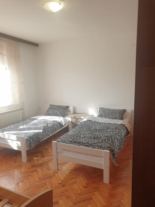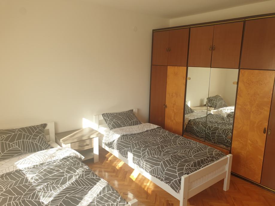 Stan od cca 80 m2 sastoji se od dvije spavaće sobe,dnevnog boravka,kuhinje,ostave,kupaone i hodnika i balkona. U stanu je posude,posteljina ,poploni jastuci,rucnici . Od aparata pecnica, ugradena ploca za kuhanje plin,frizder sa