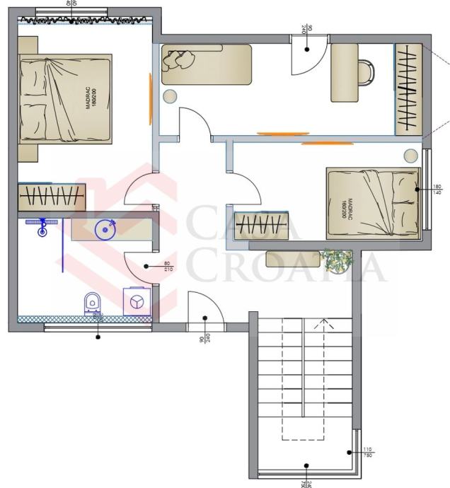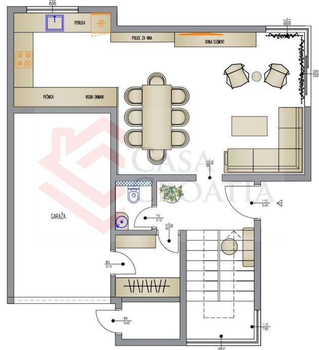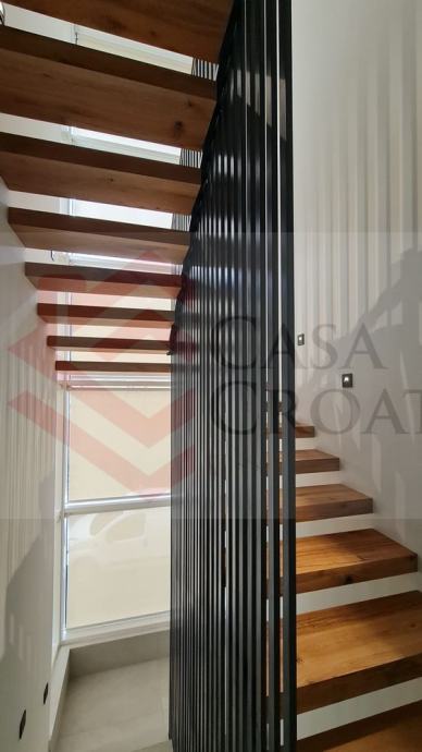 U prizemlju imamo dnevni boravak s blagovaonicom i kuhinjom, gostinjski WC, tehničku sobu, ulazni prostor, terase i garaža. Na 1. katu su tri spavaće sobe, kupaonica i terasa, a na 2. katu master spavaća soba s kupaonicom i terasa.