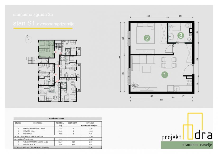 Stan se sastoji od ulaza, dnevnog boravka s kuhinjom, spavaće sobe i kupaonice ukupne površine 37,89 m2 (NKP 37,89 m2).