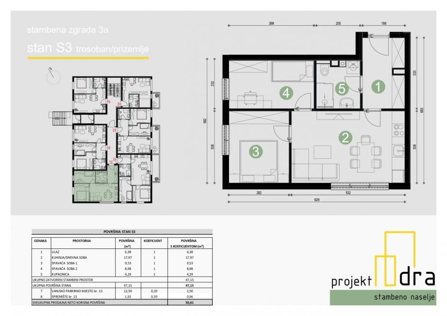 3-SOBAN STAN NKP 47,15 m2 SA VANJSKIM PARKIRNIM MJESTOM I SPREMIŠTEM