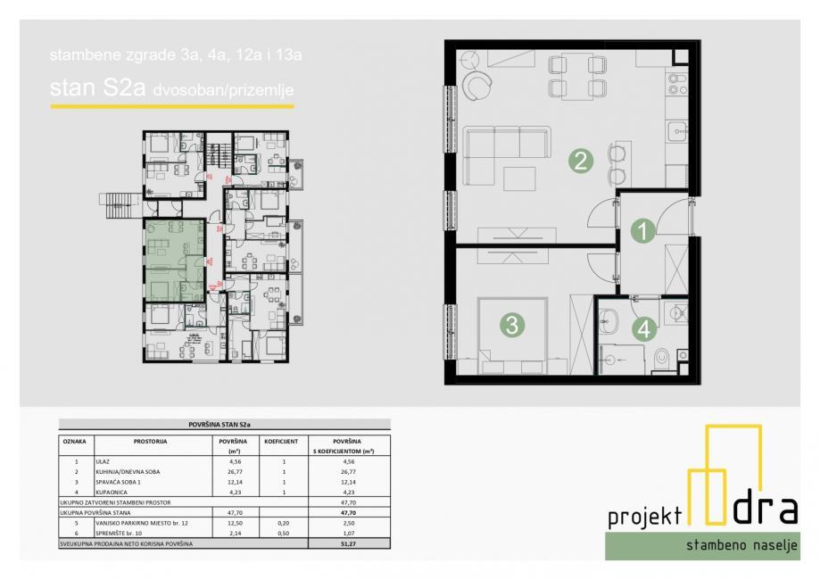 2-SOBAN STAN NKP 47,70 m2 SA VANJSKIM PARKIRNIM MJESTOM I SPREMIŠTEM