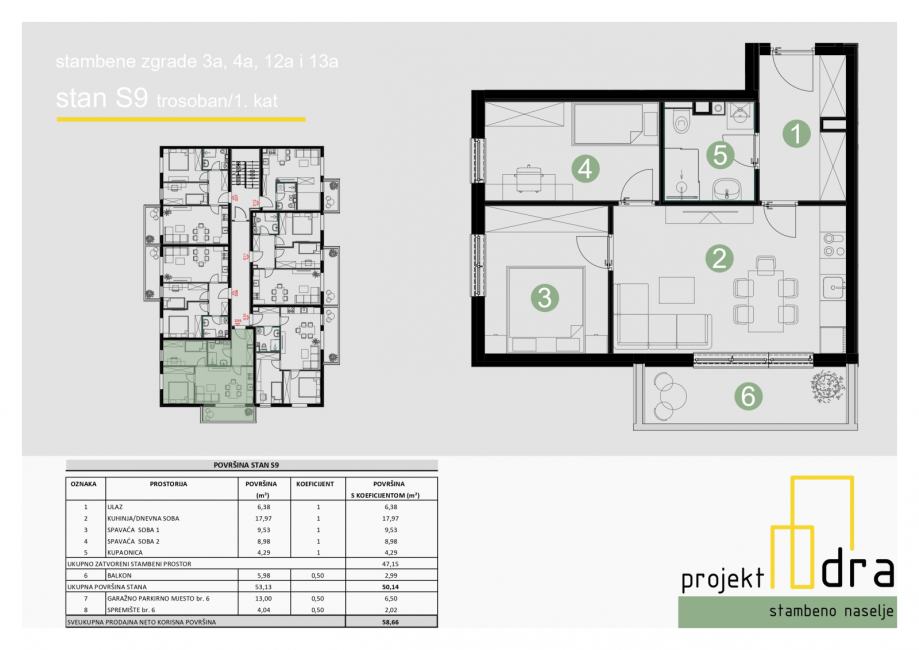 Stan se sastoji od ulaza, dnevnog boravka sa kuhinjom, 2 spavaće sobe, kupaonice i balkona ukupne površine 53,13 m2 (NKP 50,14 m2)