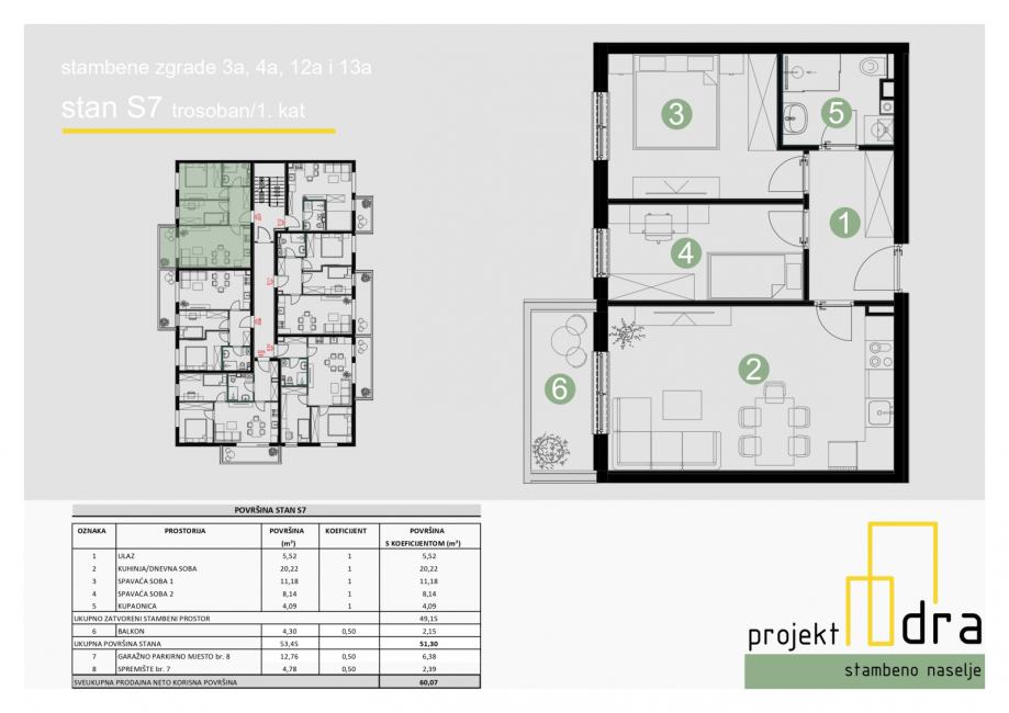 Stan se sastoji od ulaza, dnevnog boravka s kuhinjom, 2 spavaće sobe, kupaonice i balkona ukupne površine 53,45 m2 (NKP 51,30 m2).