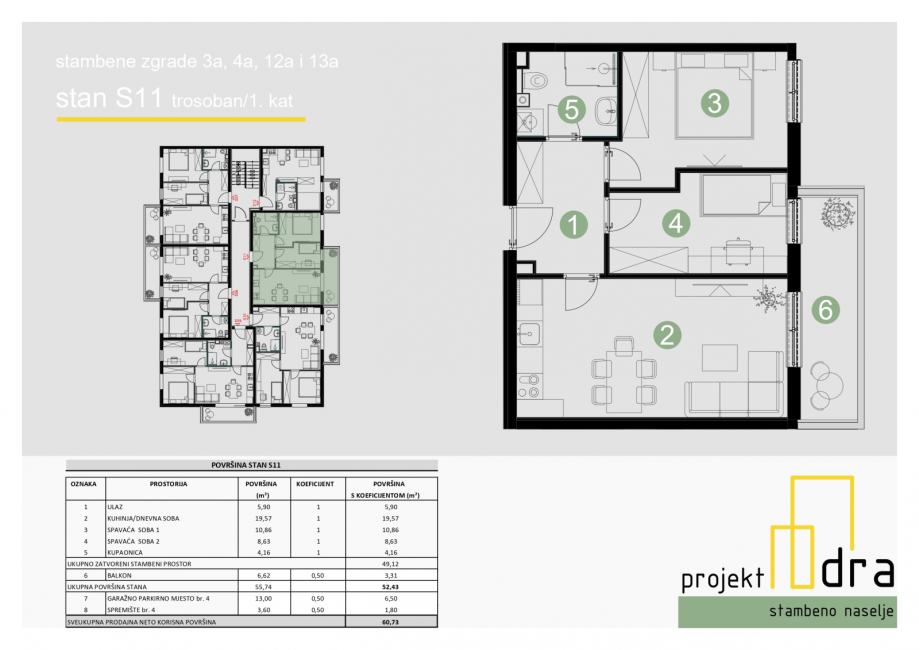 Stan se sastoji od ulaza, dnevnog boravka s kuhinjom, 2 spavaće sobe, kupaonice i balkona ukupne površine 55,74 m2 (NKP 52,43 m2). Stan se nalazi na 1. katu zgrade.