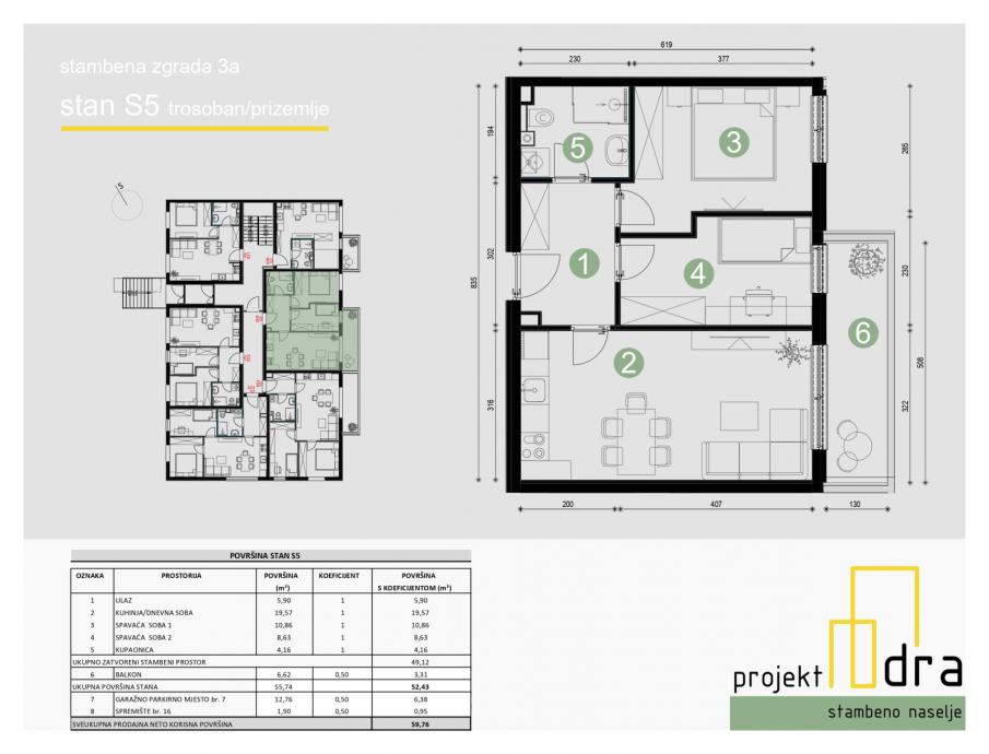 Stan se sastoji od ulaza, kuhinje s dnevnim boravkom, 2 spavaće sobe, kupaonice i balkona ukupne površine 55,74 m2 (NKP 52,43 m2). Stan se nalazi u prizemlju zgrade