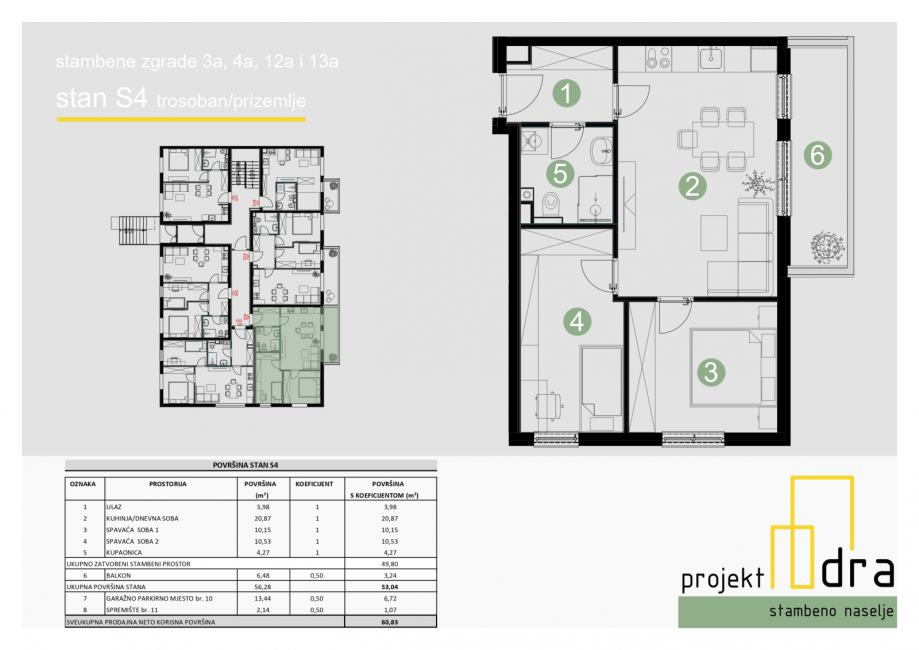Stan se sastoji od ulaza dnevnog boravka s kuhinjom, 2 spavaće sobe, kupaonice i balkona ukupne površine 56,28 m2 (NKP 53,04 m2)