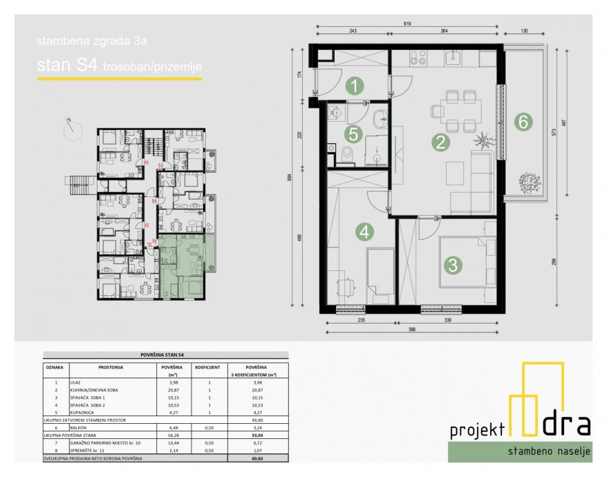 Stan se sastoji od ulaza dnevnog boravka s kuhinjom, 2 spavaće sobe, kupaonice i balkona ukupne površine 56,28 m2 (NKP 53,04 m2). Stan se nalazi u prizemlju zgrade.