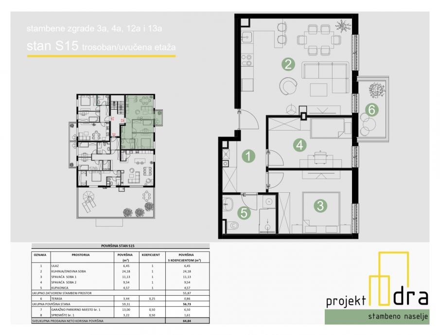 3-SOBAN STAN NKP 56,73 m2 SA GARAŽNIM PARKIRNIM MJESTOM I SPREMIŠTEM