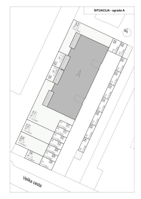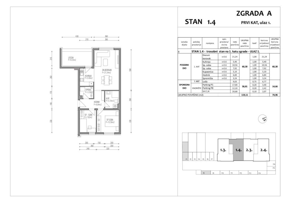 Zatvoreni dio neto korisne površine 60,30 m2 sastoji se hodnika, dnevnog boravka s kuhinjom i blagovaonicom, dvije spavaće sobe i kupaonice s WC-om. Uz to stan ima i lođu od 9,03 m2 (obračunski 6,77 m2), dva parkirna mjesta od 12,10 m2 i 17 m2 (obračunski 2,42 m2 i 3,40 m2) i vrt od 20,68 m2 (obračunski 2,07 m2).