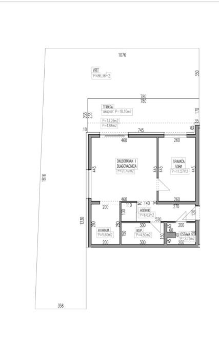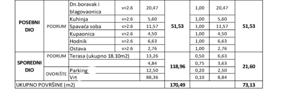 Tlocrtna površina stana iznosi 52 m2, iz stana se izlazi na prostranu terasu površine 18m2, stanu pripada vrt površine 90 m2 i jedno vanjsko parkirno mjesto površine 13 m2.