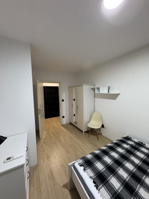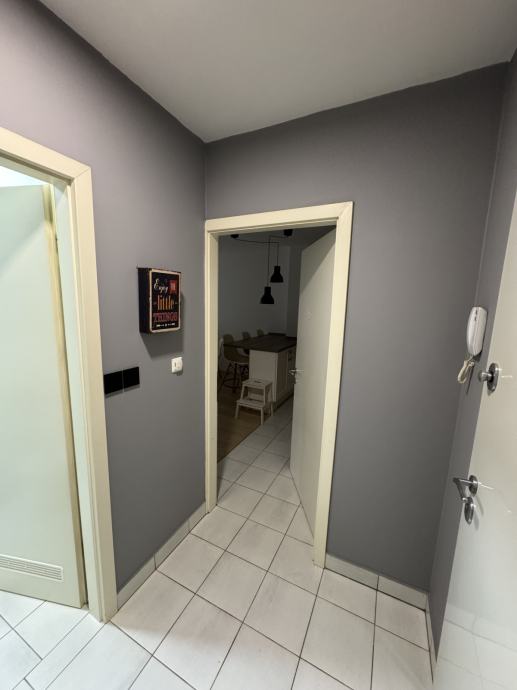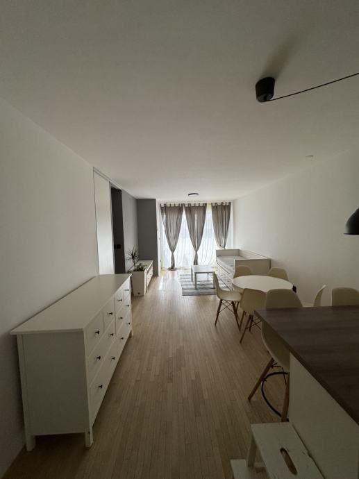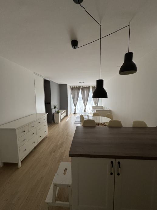 Dvosoban stan koji se sastoji od ulaza, kupaone, open space kuhinje s blagovaonom , dnevnim boravkom, te spavaćom i radnom sobom.